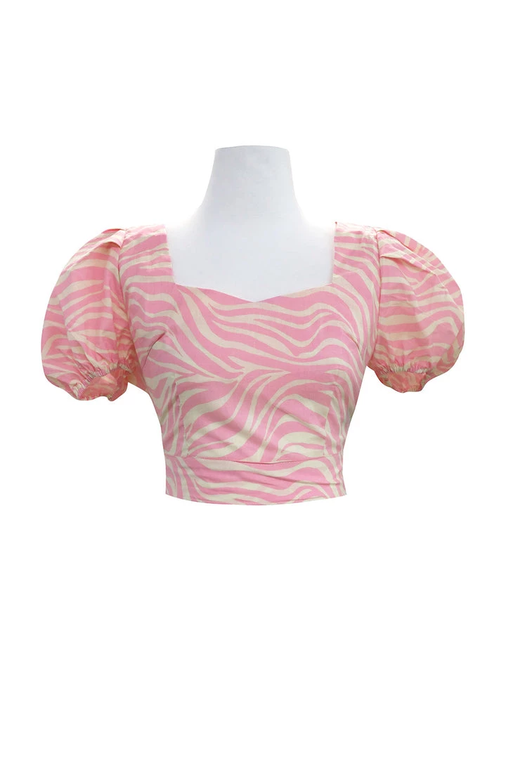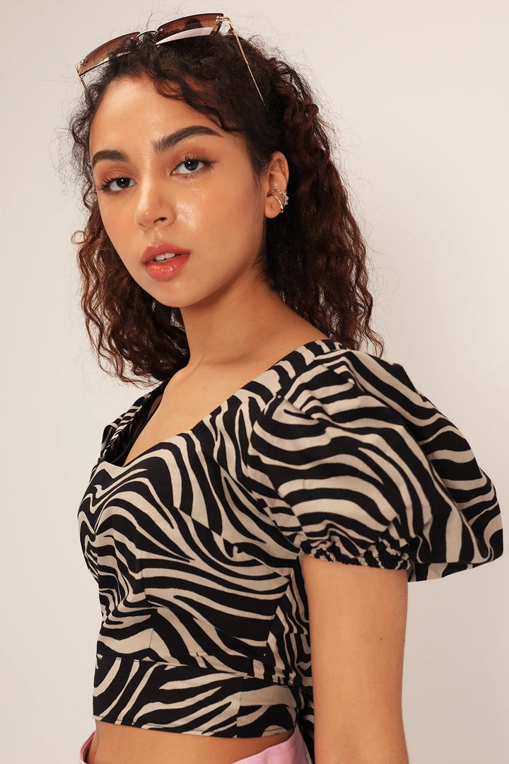 - This blouse features a zebra printed cotton material all over, a sweetheart neckline, puffed sleeves, and a bare back design with a self-tie closure at waist