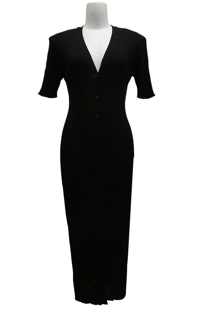 - This dress features a ribbed knit material all over, a maxi length silhouette, a fitted silhouette, a slit detail at side, and button down closure at the front