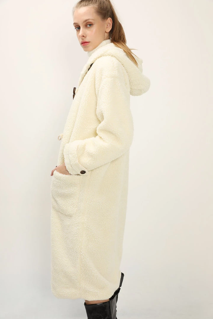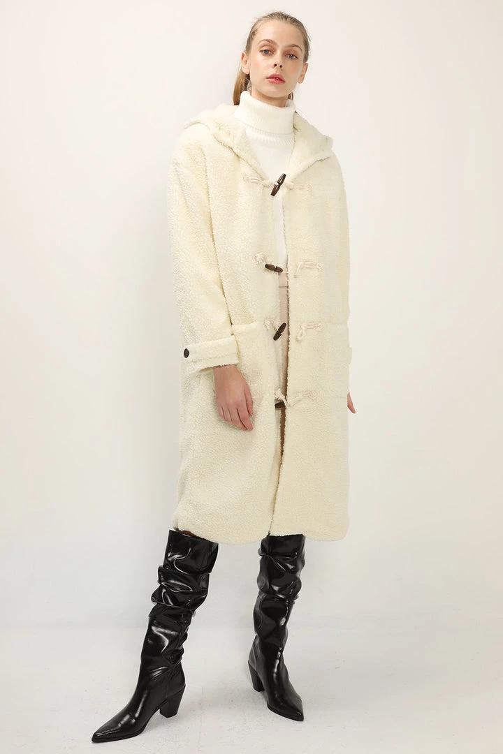 - This duffle coat features a super cozy teddy boucle material all over, a maxi length silhouette, a hoodie detail, a toggle button detail, and dual patched pockets at side