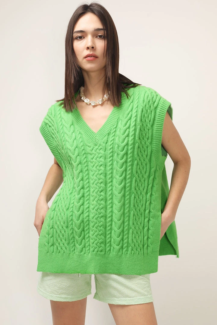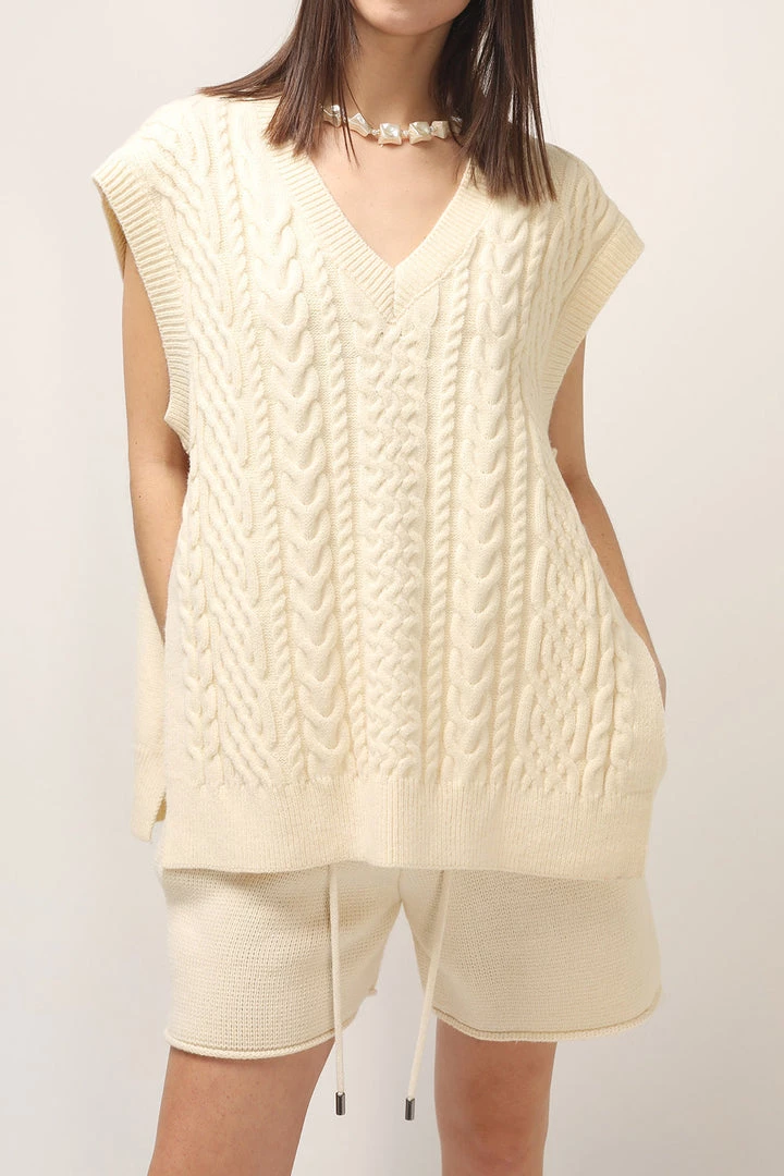 - Featuring a fisherman knit material all over, a ribbed V-neck, an oversized fit, a side split detail, and pull on style