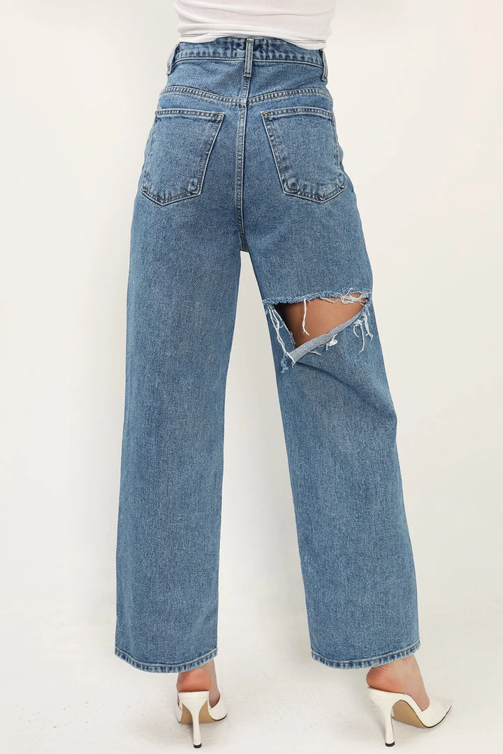 - Featuring a cotton denim material all over, a wide leg fit silhouette, dual pockets at sides, a zip fly closures at front, and a slash-cut detail at thigh & back