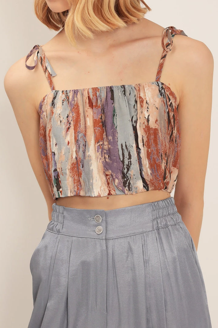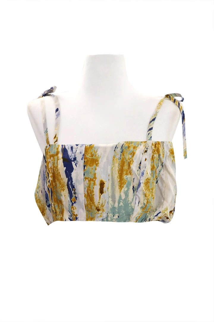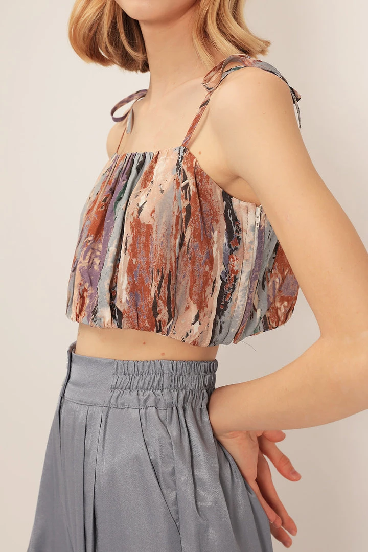 - This top features a tie dye printed all over, a cami top design with a self-tie shoulder string detail, and a cropped length silhouette