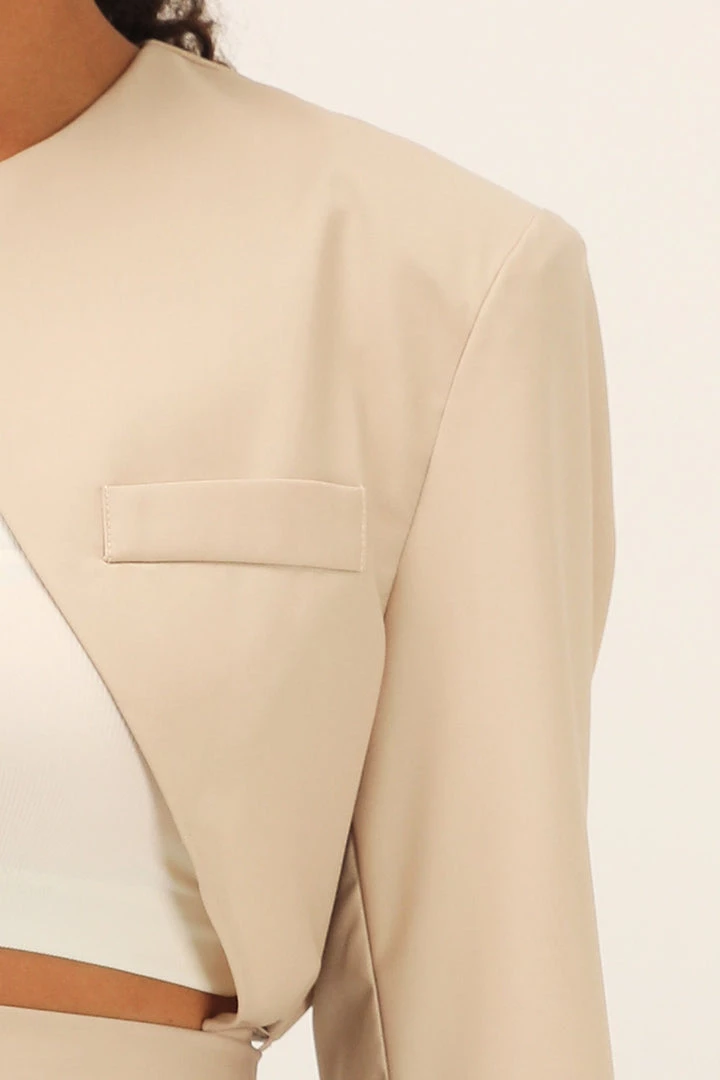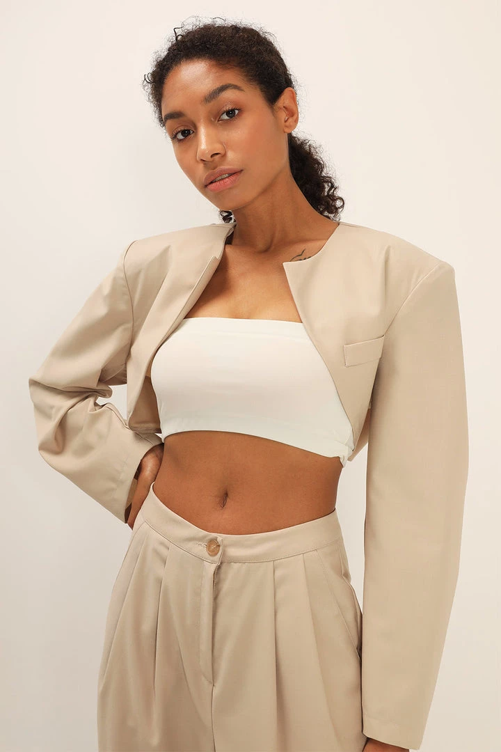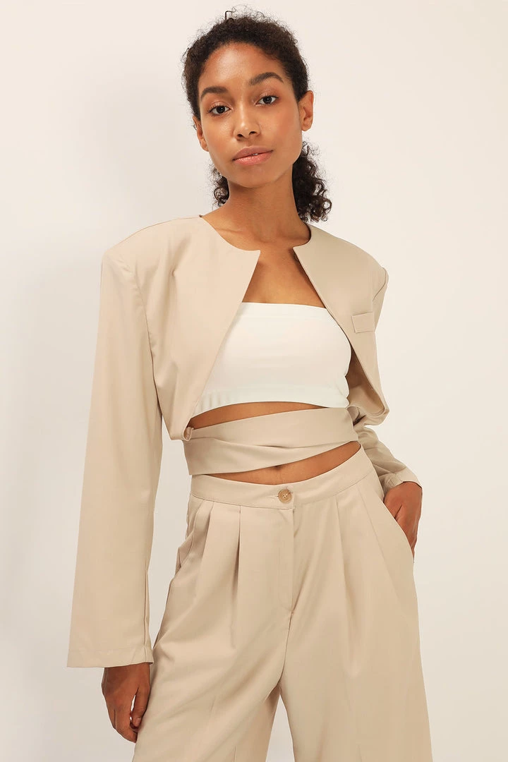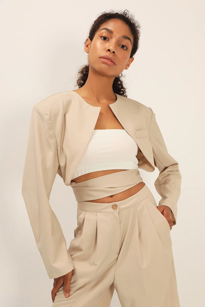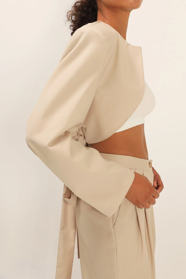 - This jacket features a collarless design at neckline, a cropped length silhouette, a tulip-like design at back with a self-tie detail, and an exaggerated padded shoulder