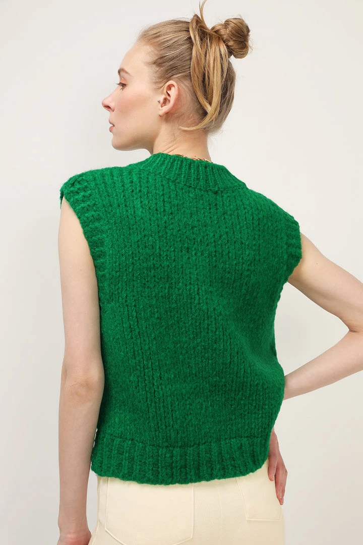 - This fuzzy knit vest features a super cozy knit material all over, a ribbed V-neckline, and pull on style
