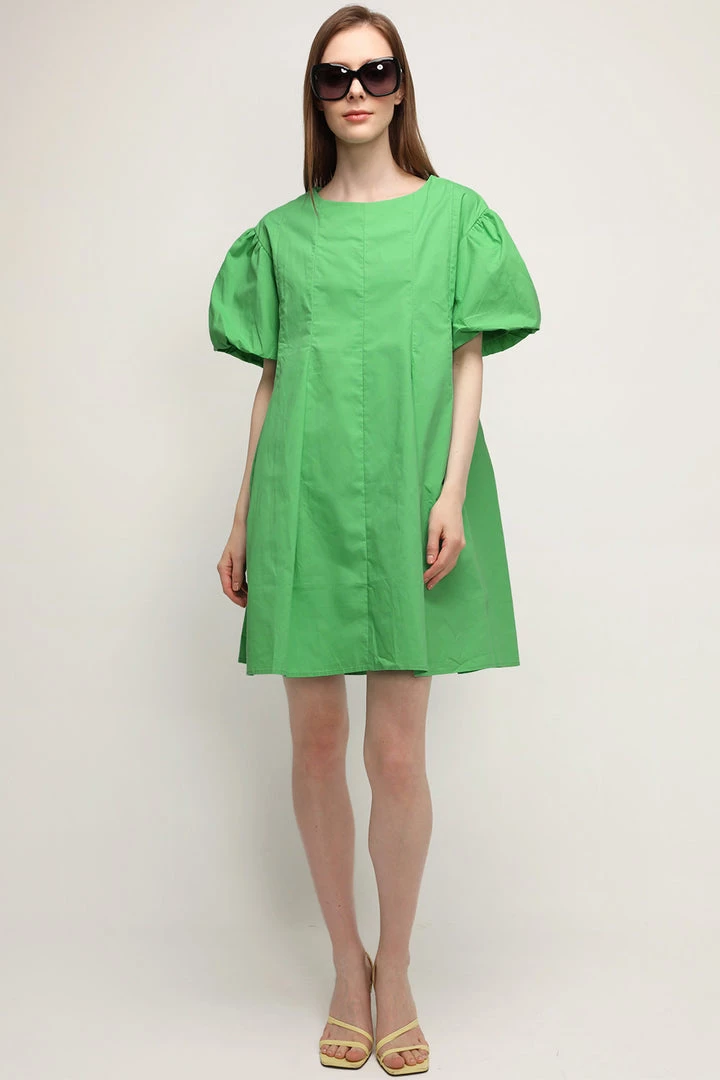 - This dress features a structured puffed sleeve detail, a collarless neckline, a comfy fit silhouette, pintuck details at waist, and a conceal zipper closure at back