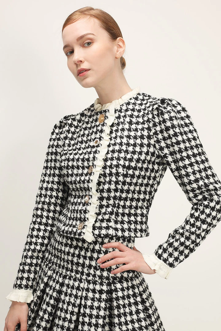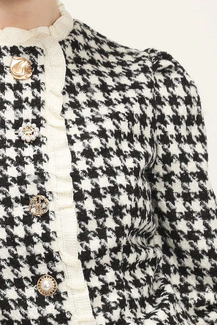 - This jacket features a super cozy houndstooth printed material all over, a collarless detail, a puff sleeve detail, a cropped length silhouette, and button closures at front
