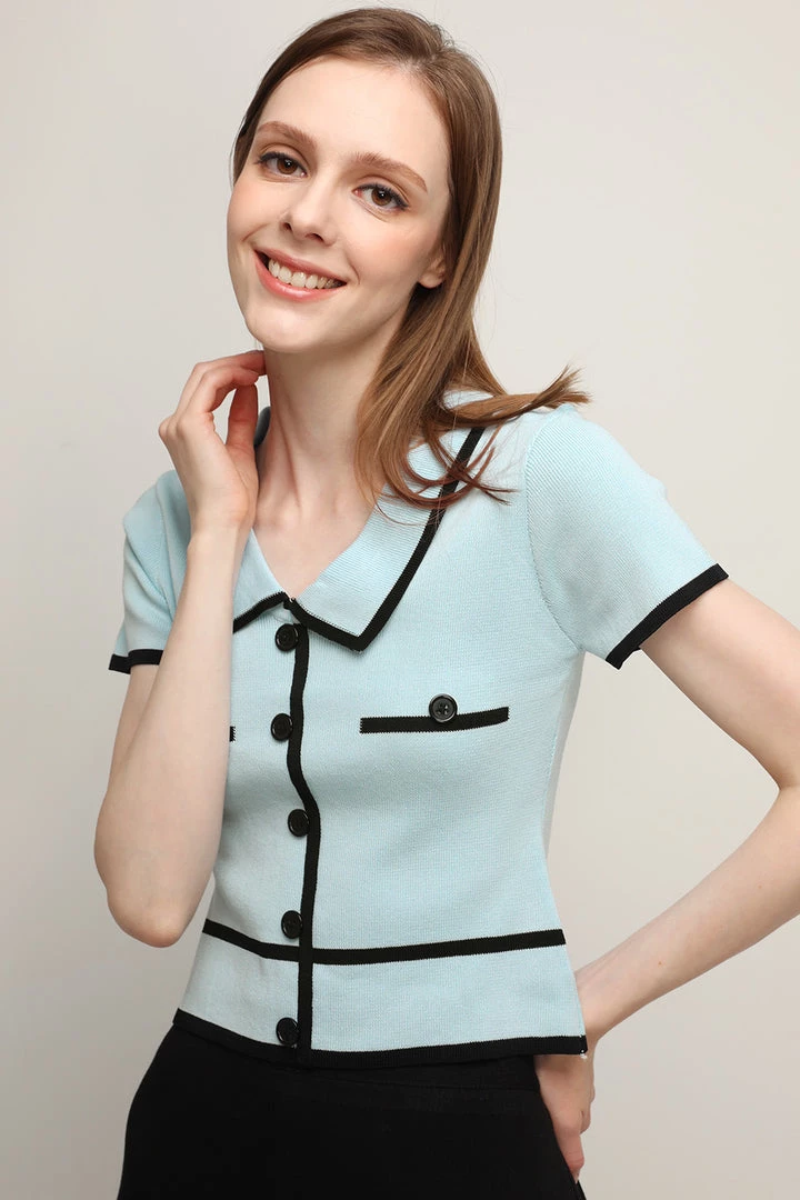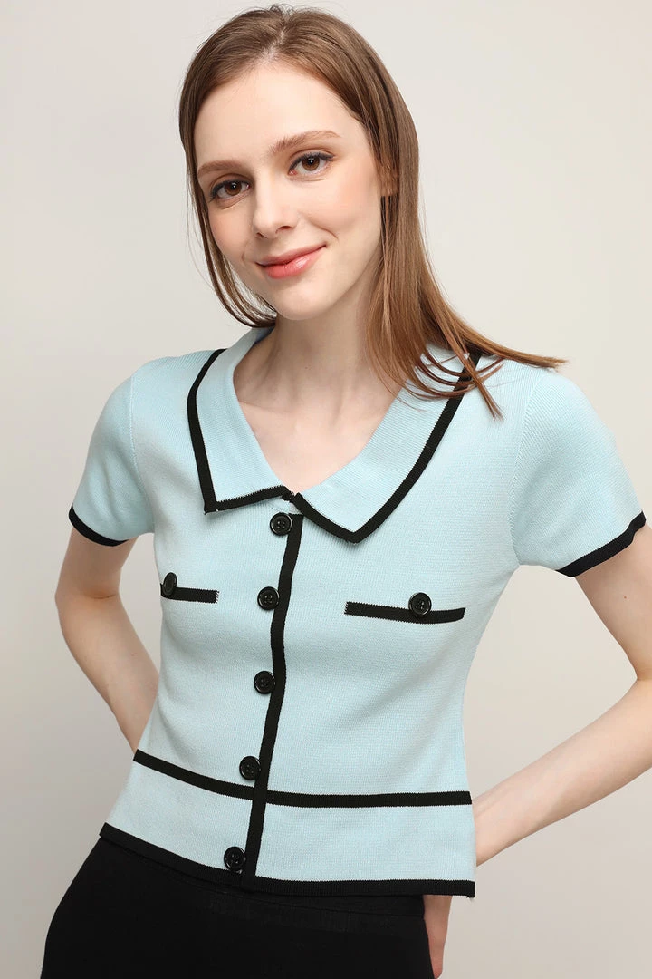 - This knit top features a well-stretchy material all over, a contrast trim detail, a crop length silhouette, a faux button effect, and pull on style