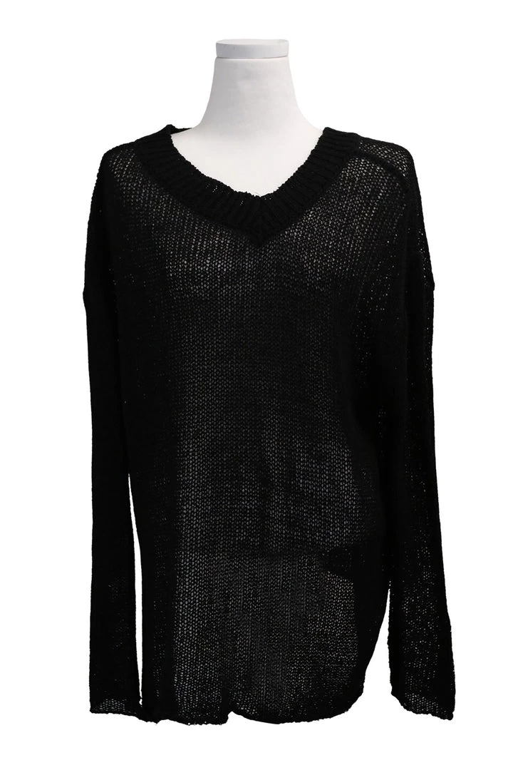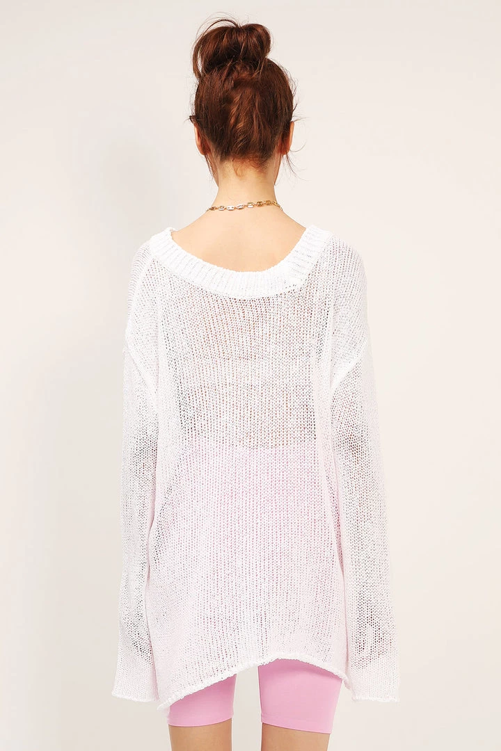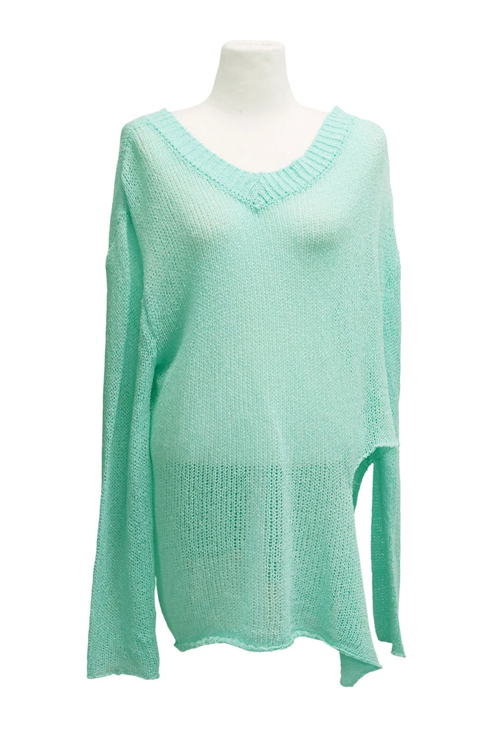 - This sweater features a sheer knitted material all over, an asymmetric ribbed neckline design, an elongated sleeve detail, a cutout detail at side, a loose fit silhouette, and pull on style