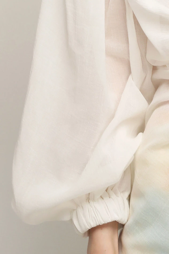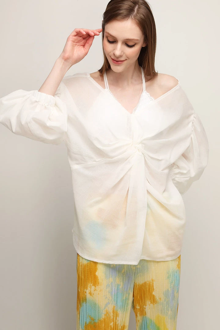 - This blouse features a sheer material all over, a deep V-neck detail, a balloon sleeve detail, a ruched detail at sleeves, a twist detail at front, and a pull-on style