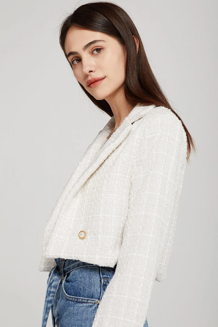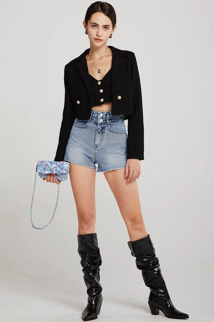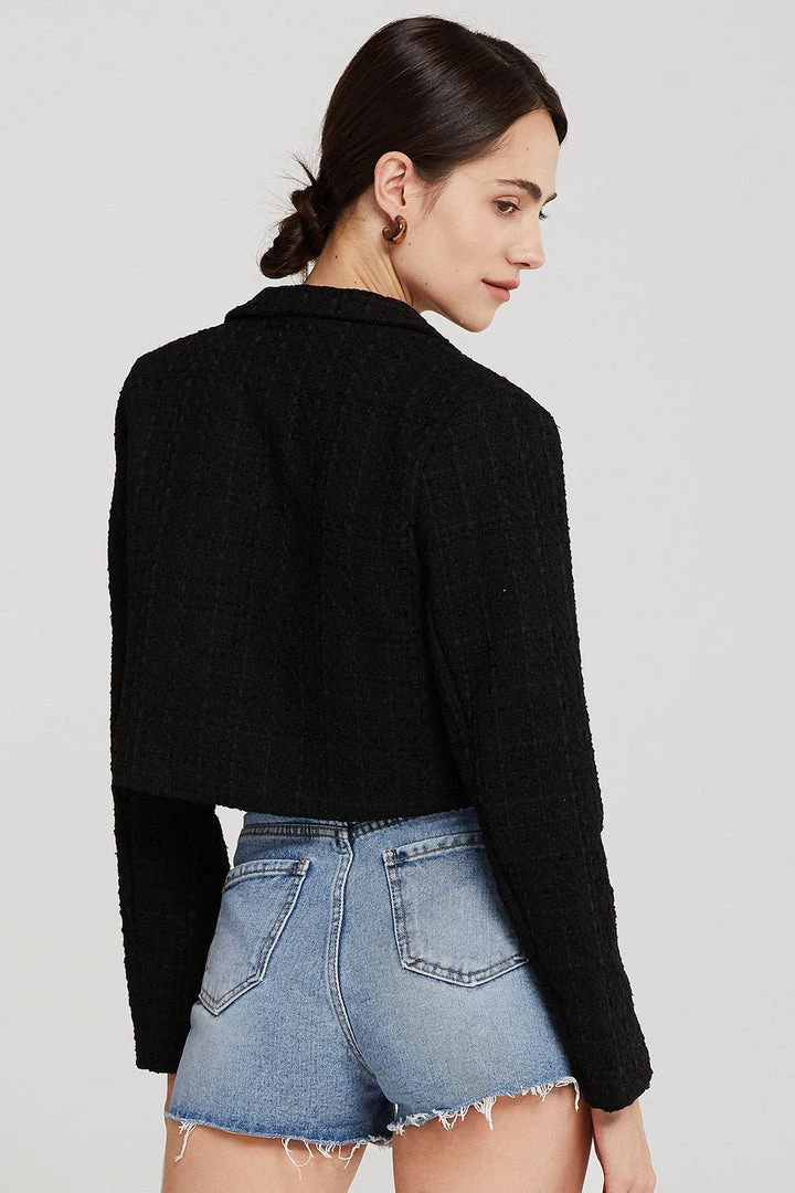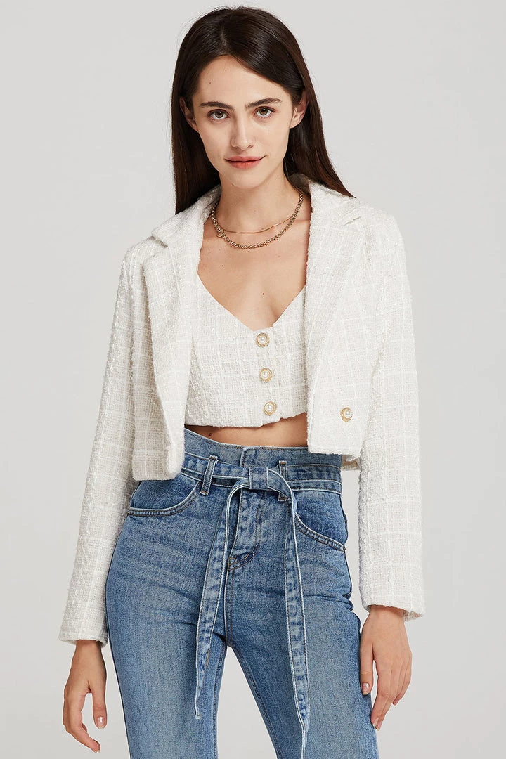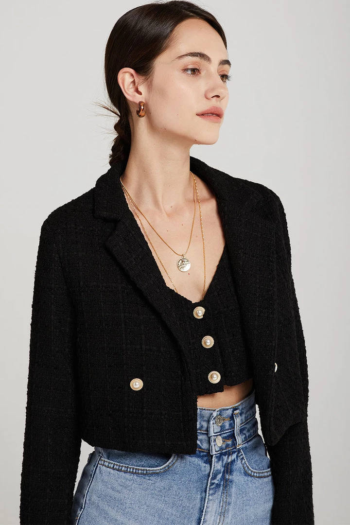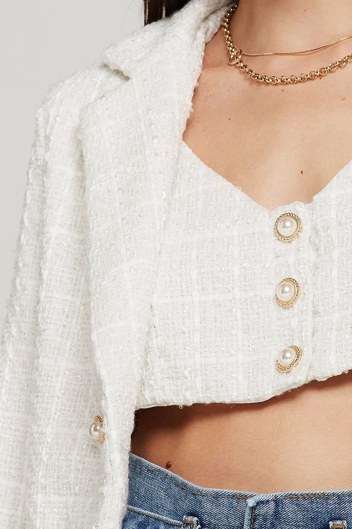 - A matching co ord set ; A boucle material jacket and boucle material crop top set