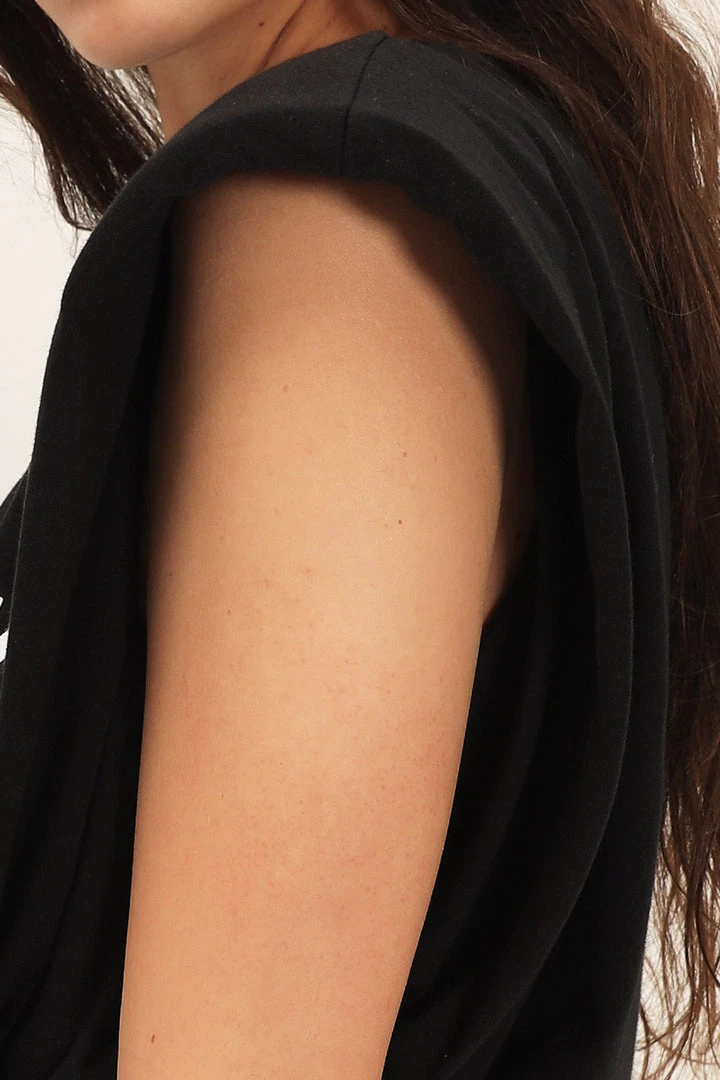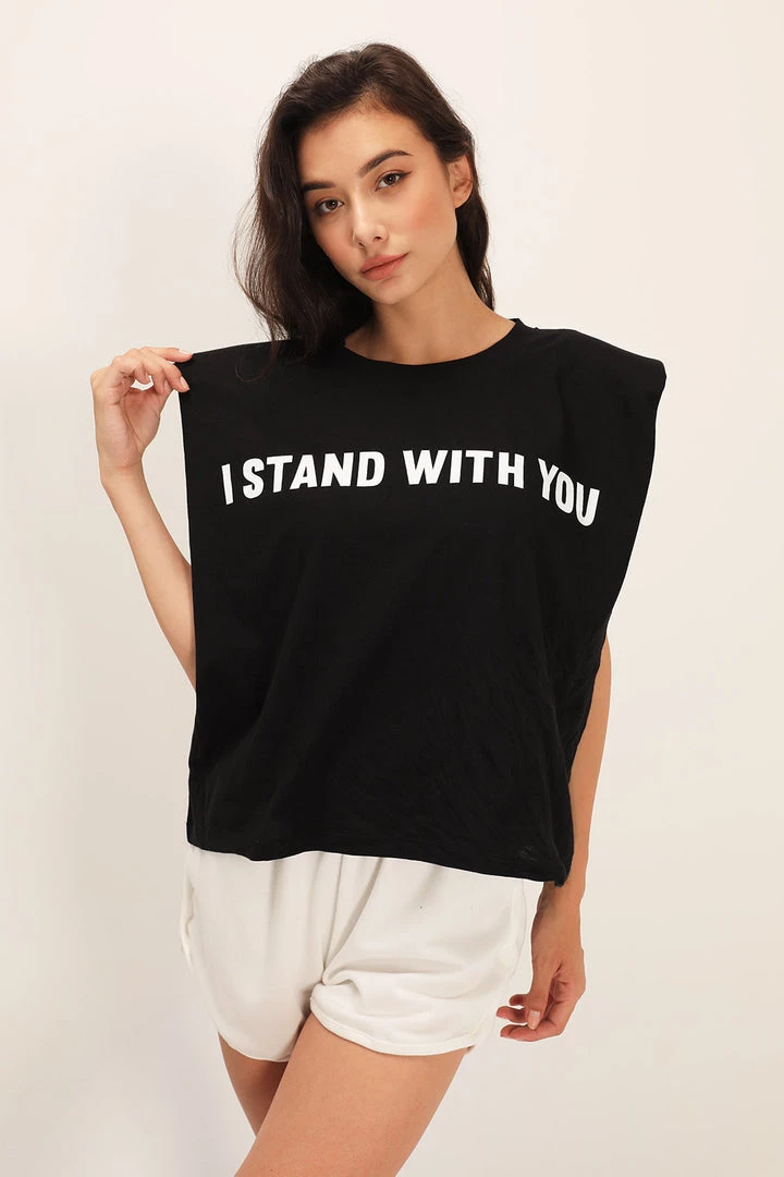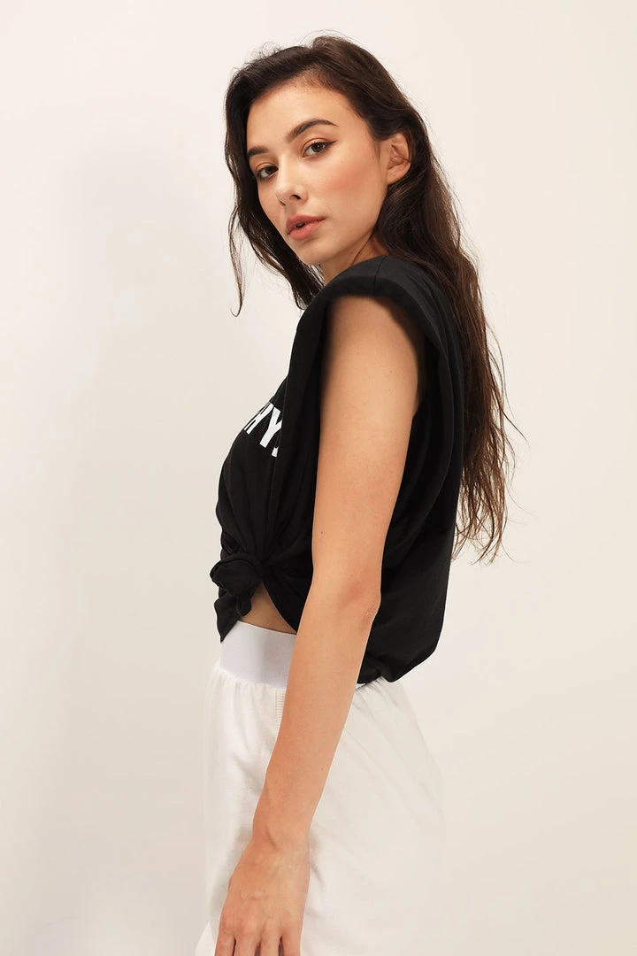 - This t-shirt features a cotton material all over, an exaggerated structured padded shoulder design, a comfy fit silhouette, a lettering detail at front, and pull on style