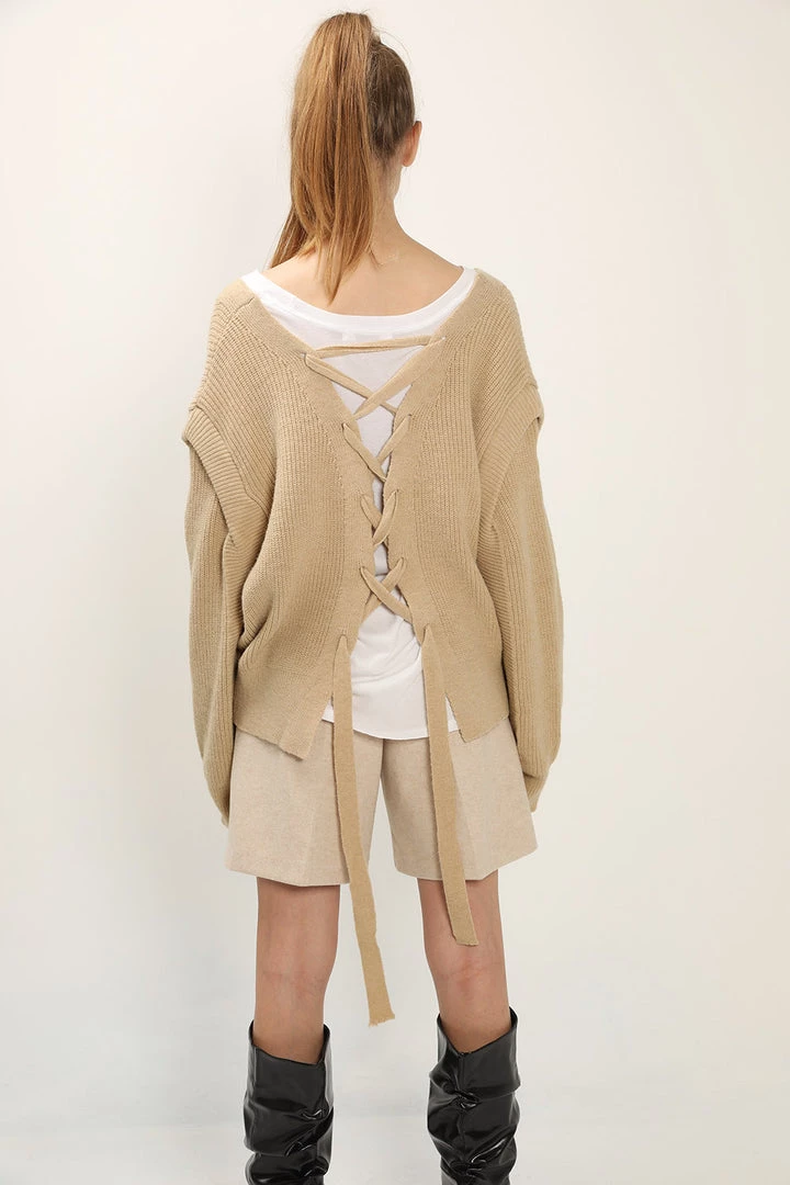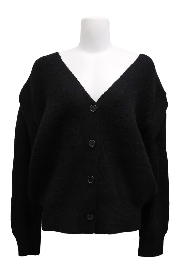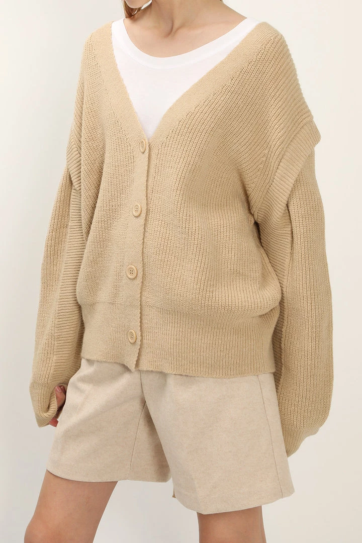 - This cardigan features a knitted material all over, an eyelet back detail, a slouchy silhouette, and button closures at front