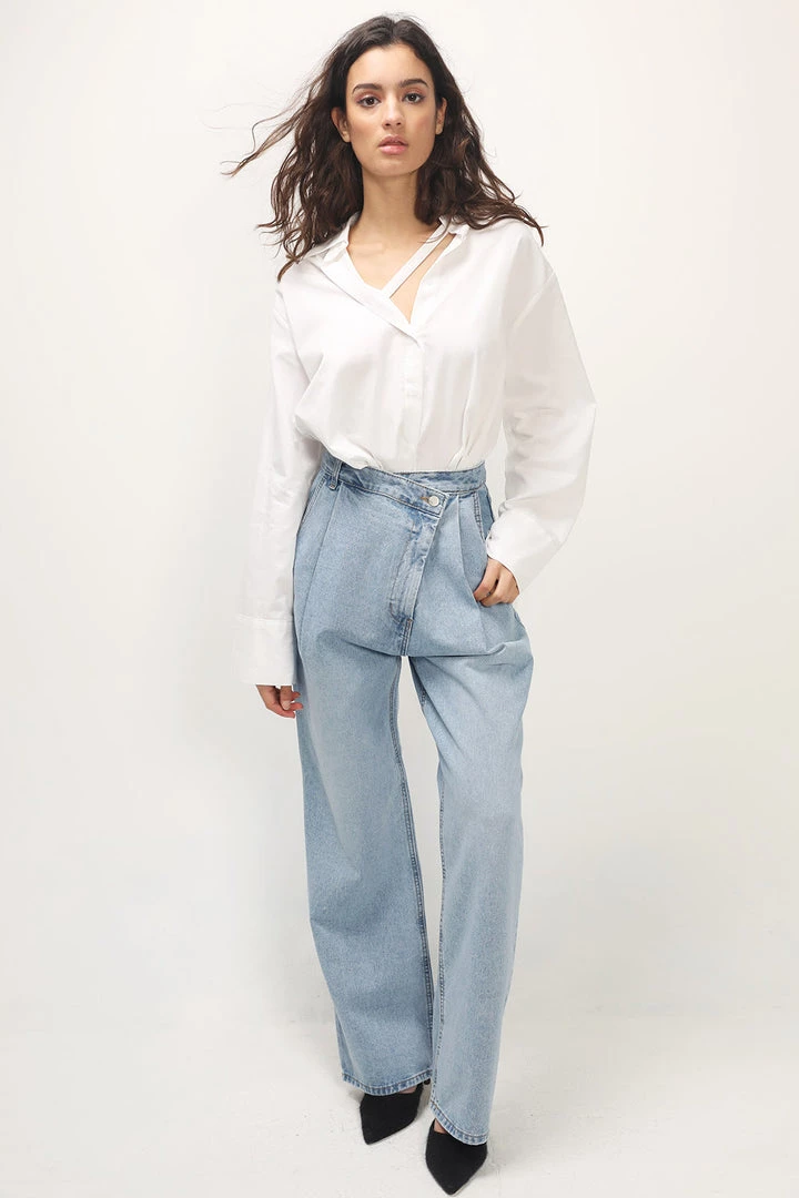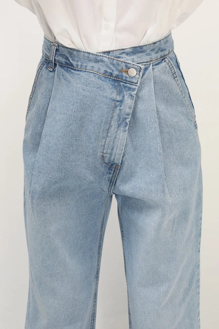 - Featuring a cotton denim material all over, a high waist silhouette, a pintuck detail at waist for comfy fit, a wrapped zip fly closures at front