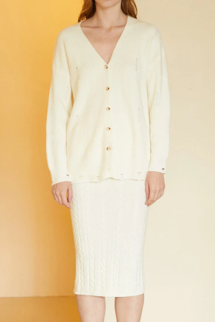 - Sweater has front button closure, V-neck, long sleeves and it’s loose fit