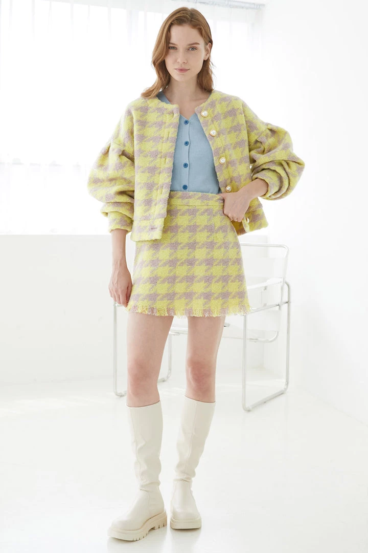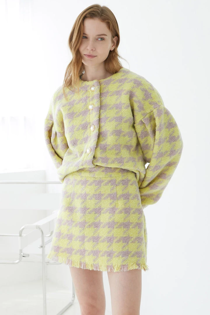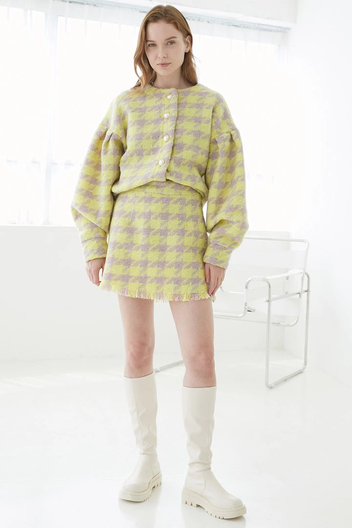 This lightly colored cardigan and skirt set is a breath of fresh air. It comes in a larger than life hound’s tooth pattern with showy pearl buttons. The sleeves are extra roomy to accentuate the design. The skirt features soft fringe and an elasticized waistband.