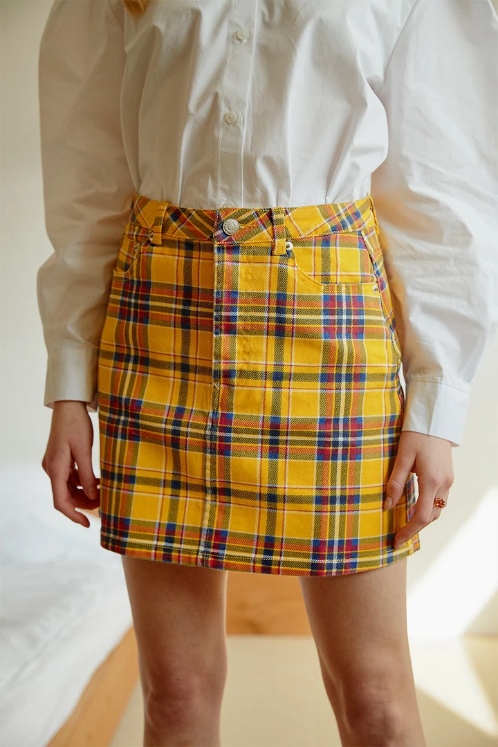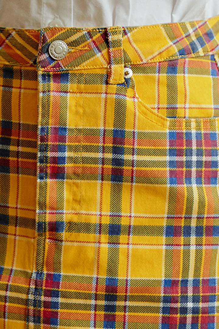 - Featuring a plaid check print all over, dual slant pockets, a mini length silhouette, and a zip fly closure