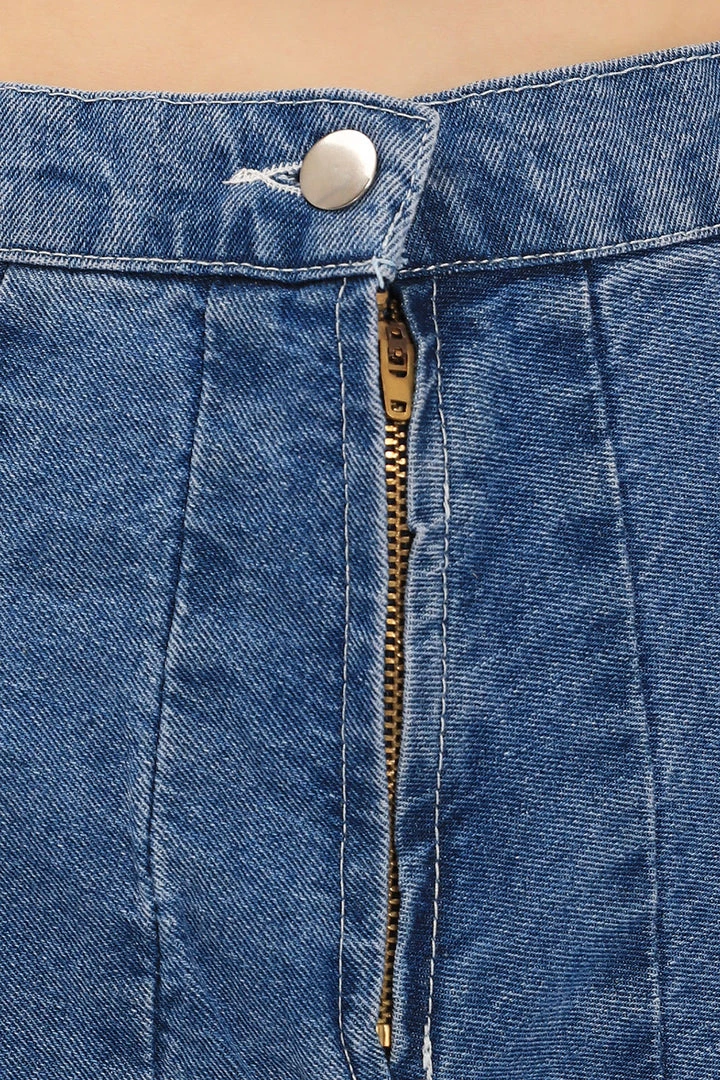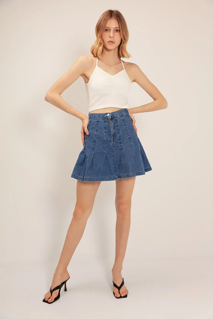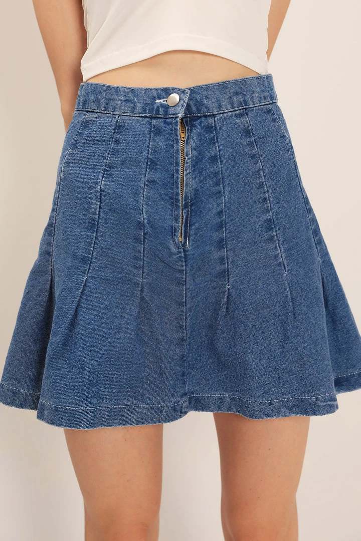 - This skirt features a denim material all over, a high waist silhouette, a pleated hem detail, and a zip fly closure at front