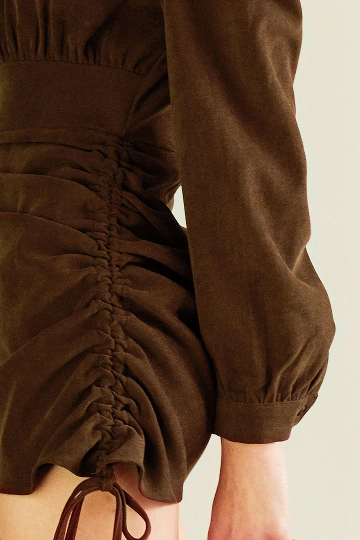 - Featuring functional drawstring ruched detail at sides, a round neckline, puffed long sleeves, a fitted waist, and a concealed zipper closure at back
