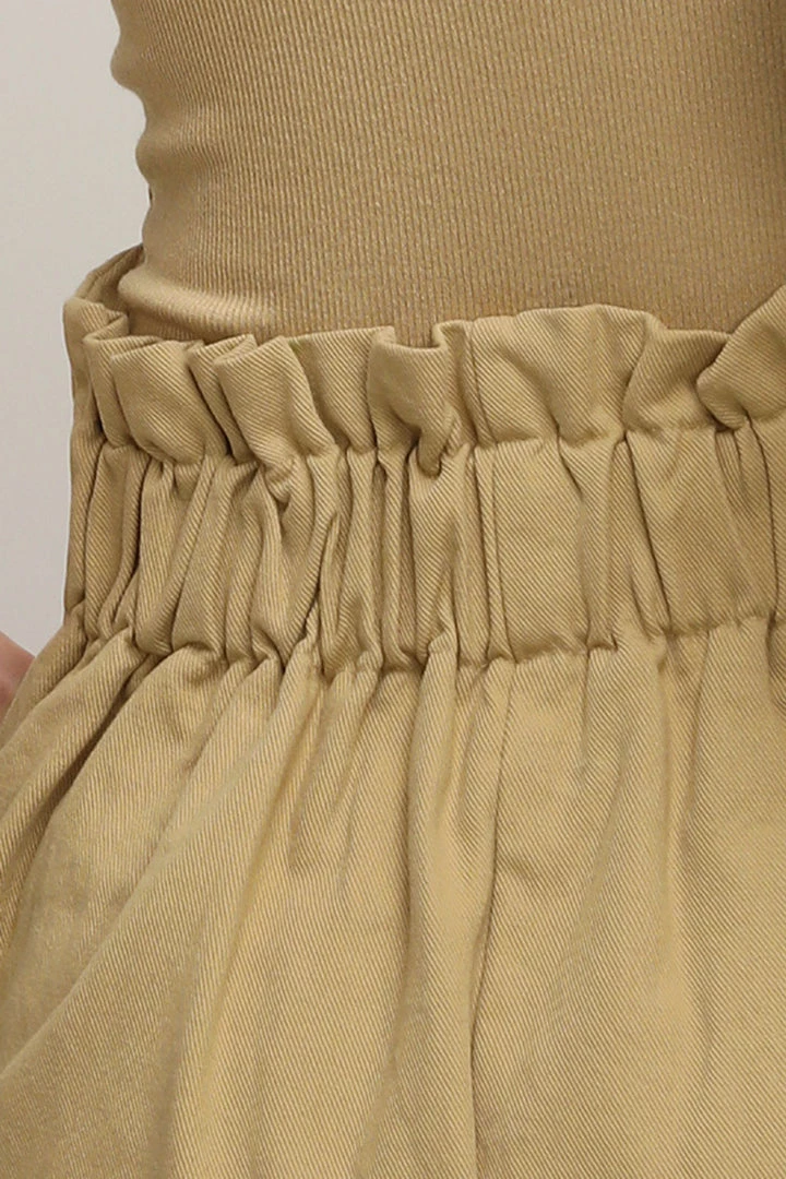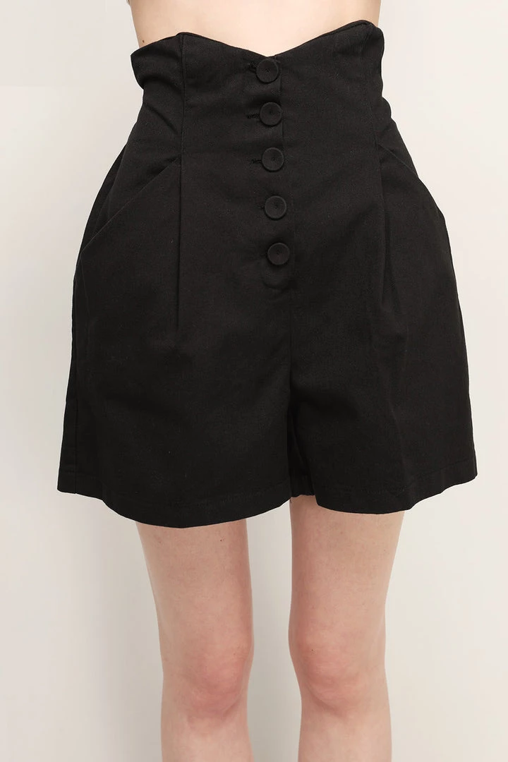 - Featuring a high waist silhouette, a pintuck detail at waist, dual pockets, a tulip upper detail, and button closures at front