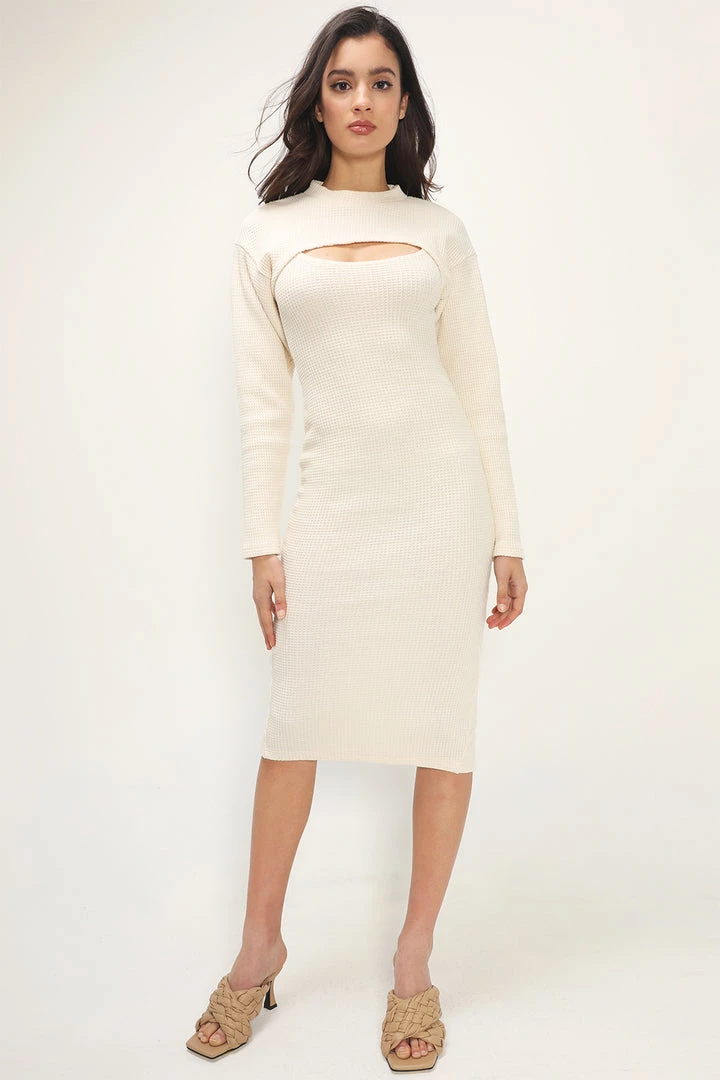 - This dress features a waffle knit material all over with same fabric crop top, a slim fit silhouette, a midi length silhouette, and pull on style