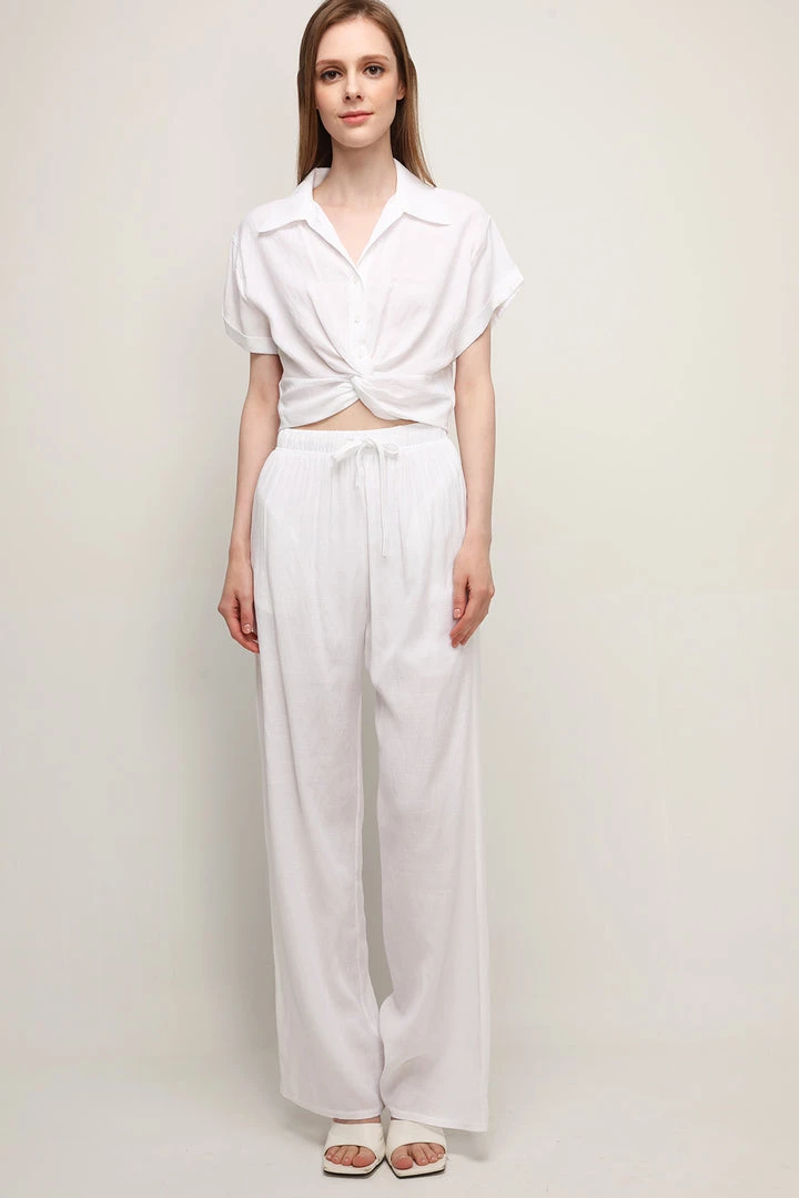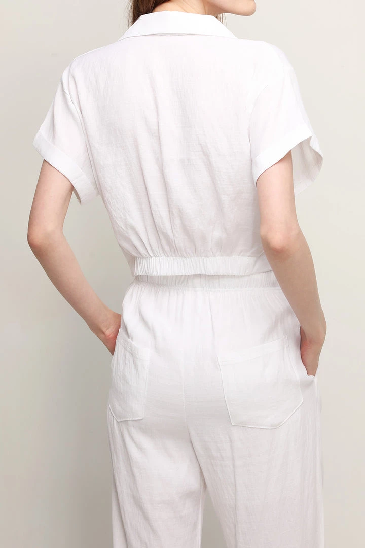 - This shirt features a linen blended material all over, a cropped length silhouette with a collared neckline, fold over sleeves detail, and button down closures at front with a twist detail