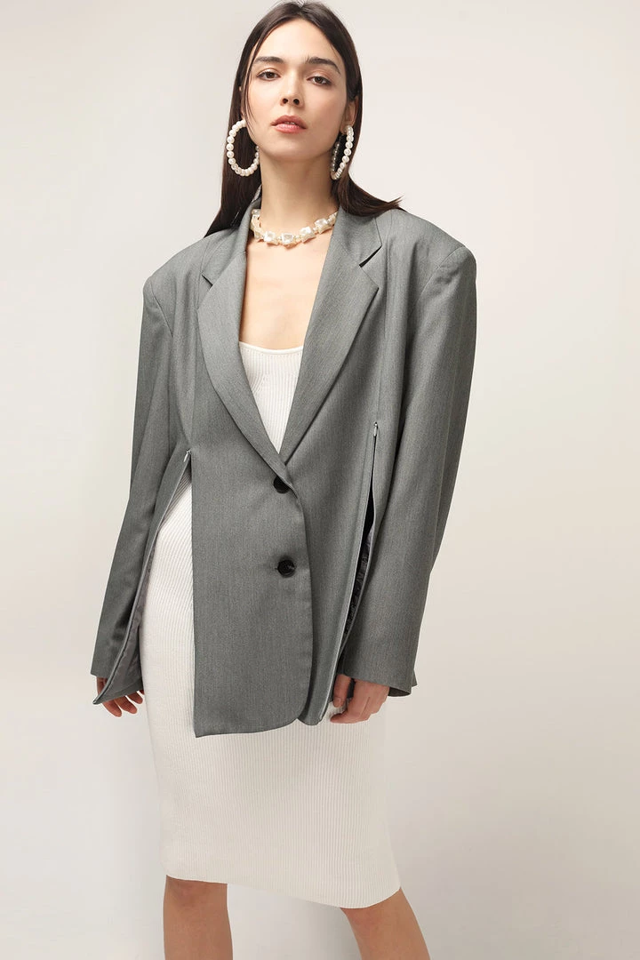 - This essential jacket features an oversized silhouette, a collared design, a single breast silhouette, and slit details with conceal zipper closure at front