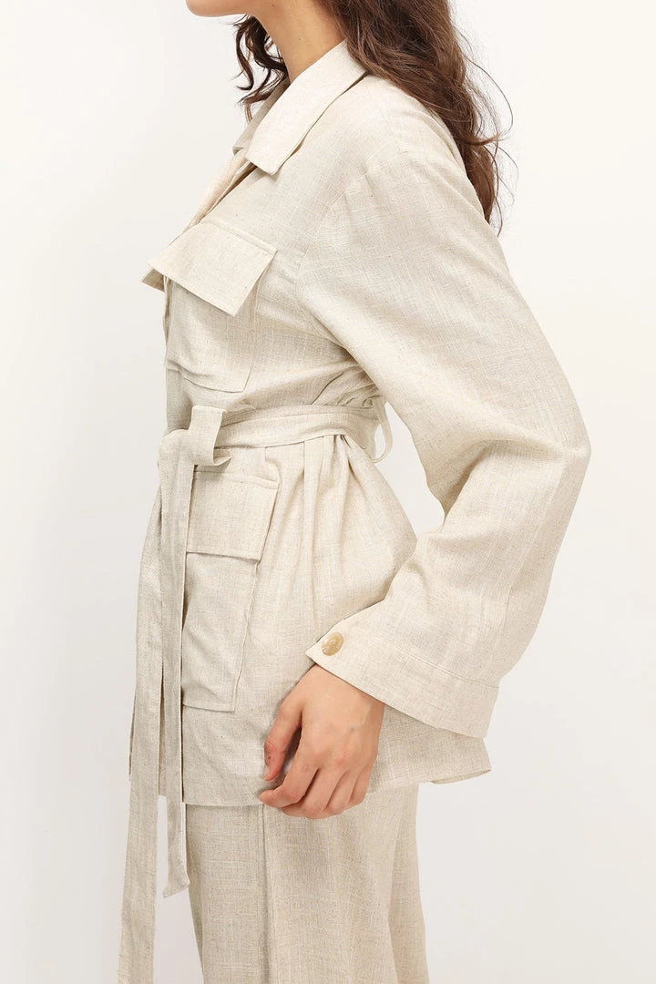 - This jacket features a linen material all over, a collared neckline, flap pockets at chest, a same fabric belt included, and button closures at front