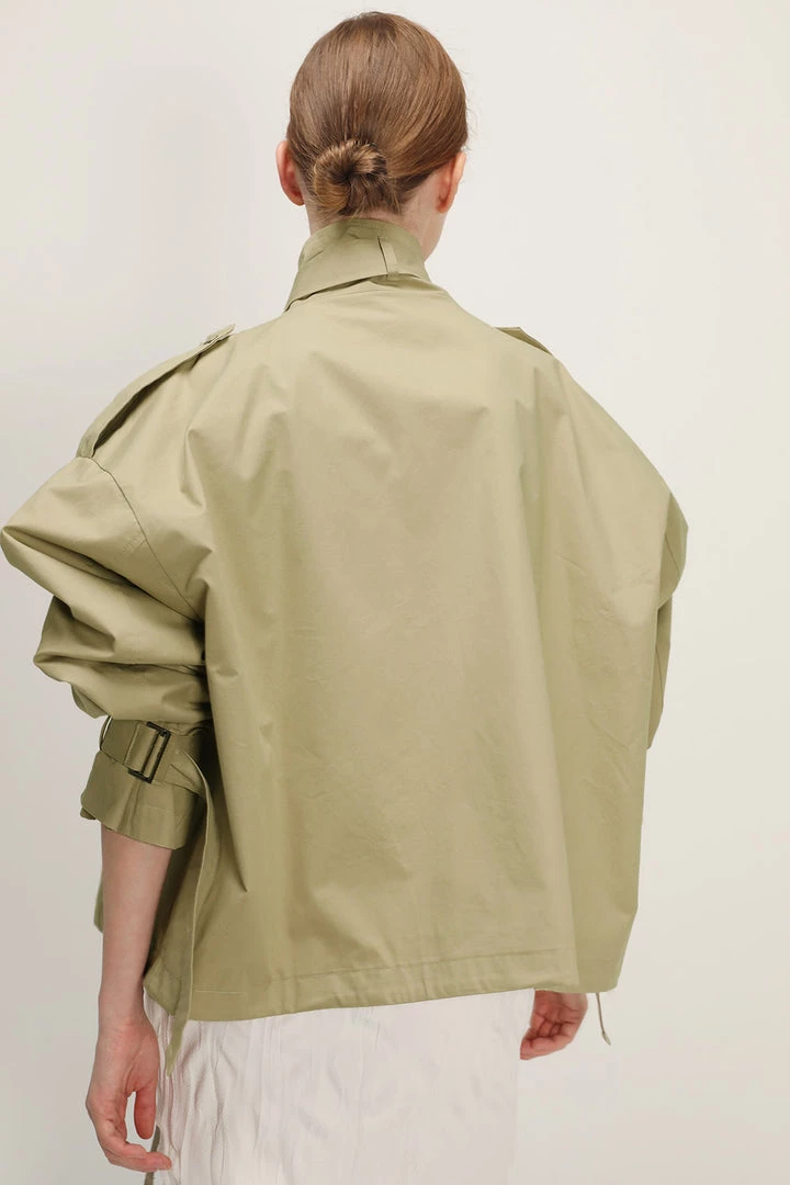 - Featuring a cropped length silhouette, snap buttons & a zipper closure at front, puff sleeves, and dual patched pockets at front