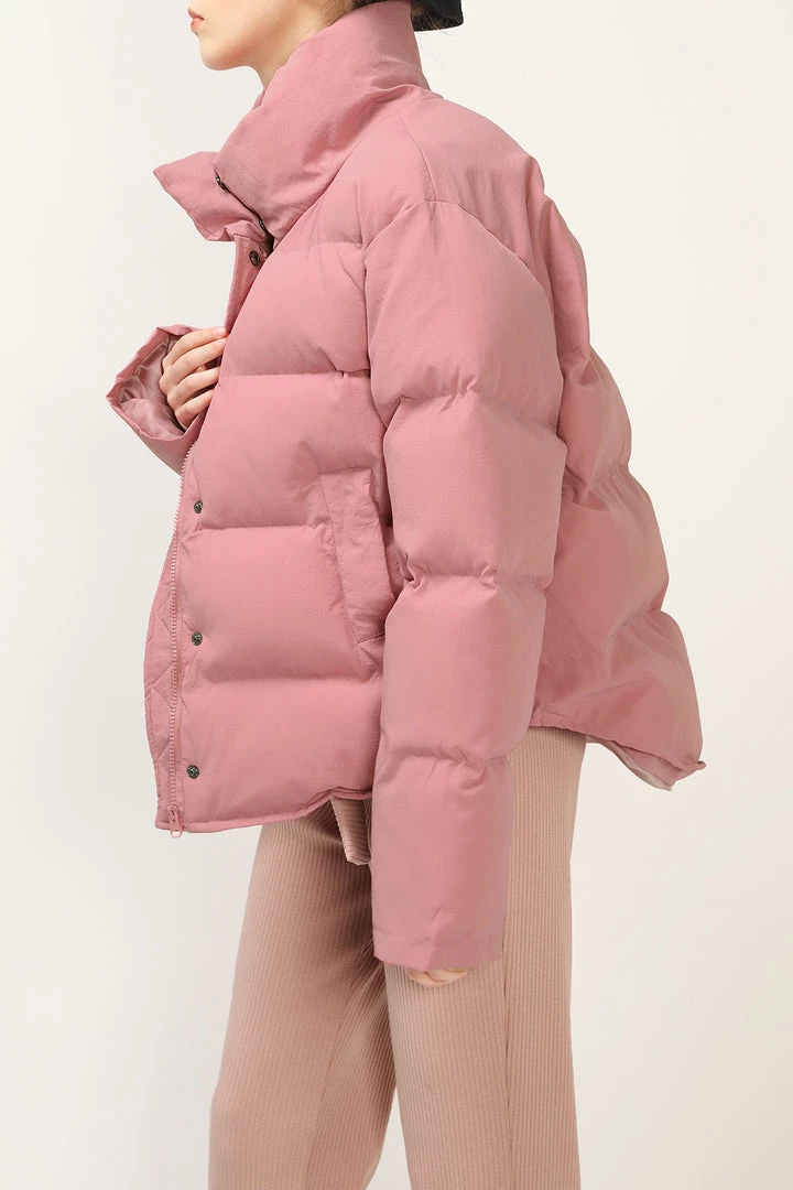 - This jacket features a padded puffer design, a cropped length silhouette, a stand collar detail, dual slant pockets at sides, and snap buttons & a zipper closure at front