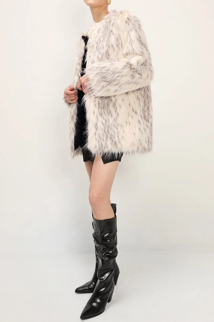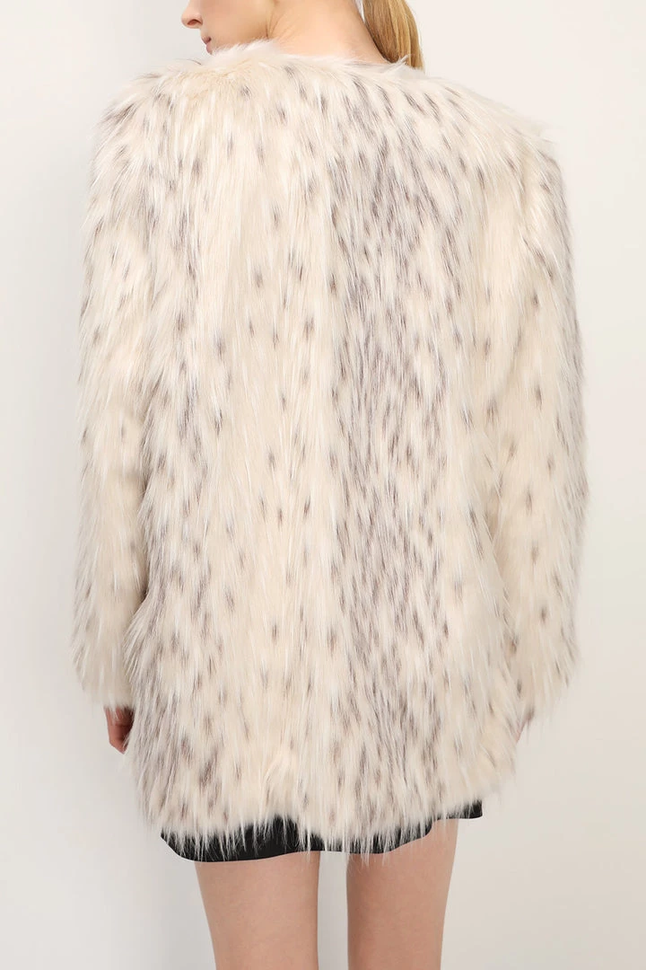 - This coat features a printed shaggy faux-fur material all over, a collarless detail, a comfy fit silhouette, and a hidden hook closure detail at front
