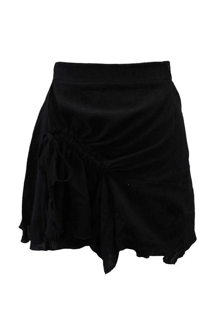 - This skirt features a textured cotton blended material all over, an asymmetric ruched ruffle detail at front, a high waist silhouette, and a concealed zipper closure at side