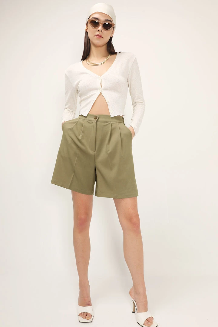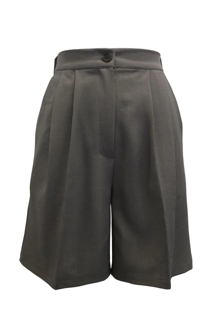 - Featuring a pintuck detail at waist, dual pockets at front, a bermuda length silhouette, and slip on style