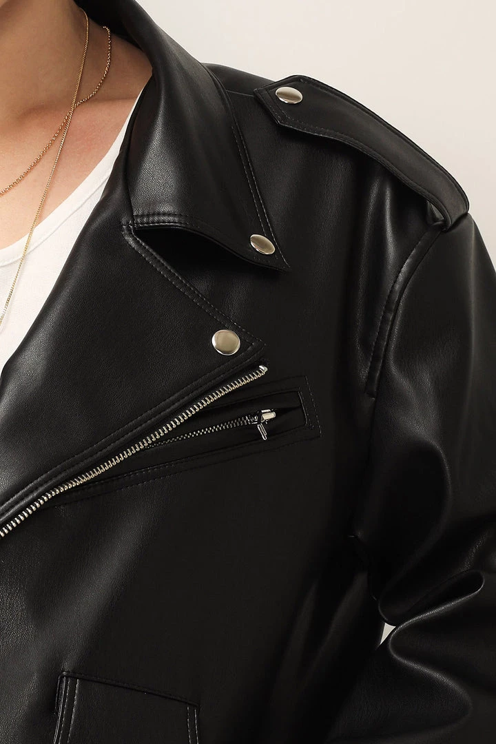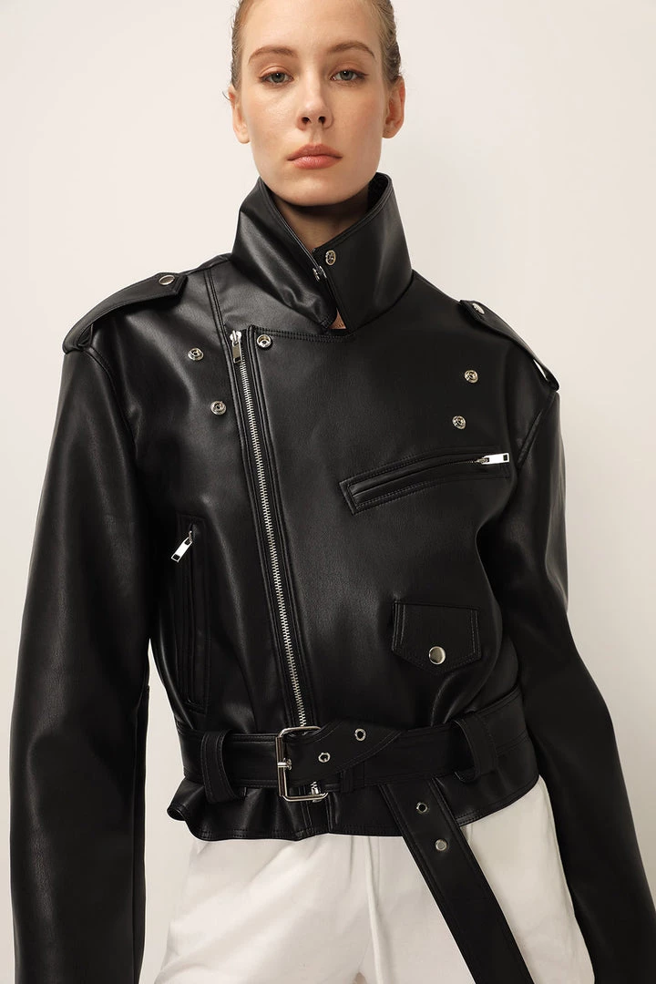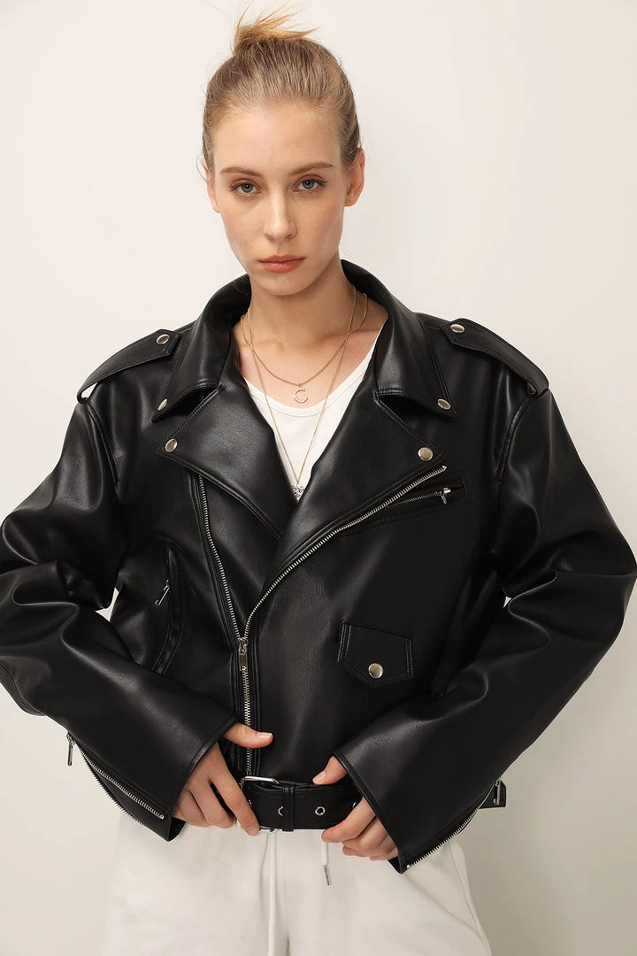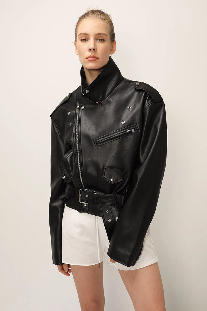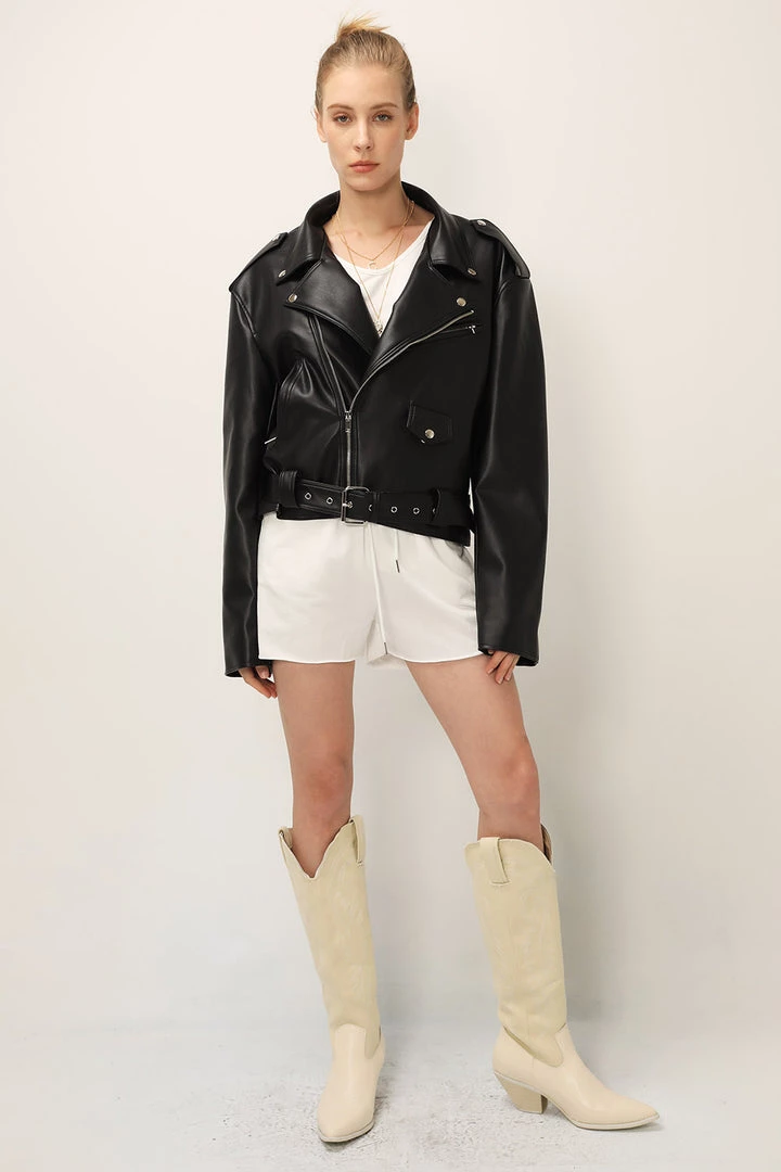 - This jacket features a soft faux-leather material all over, an oversized fit silhouette, a cropped length silhouette, a same fabric belt included at waist, a zip-up closure at front