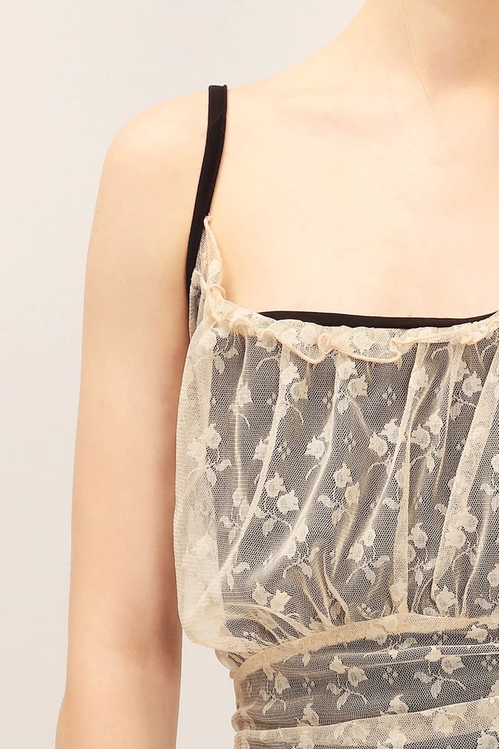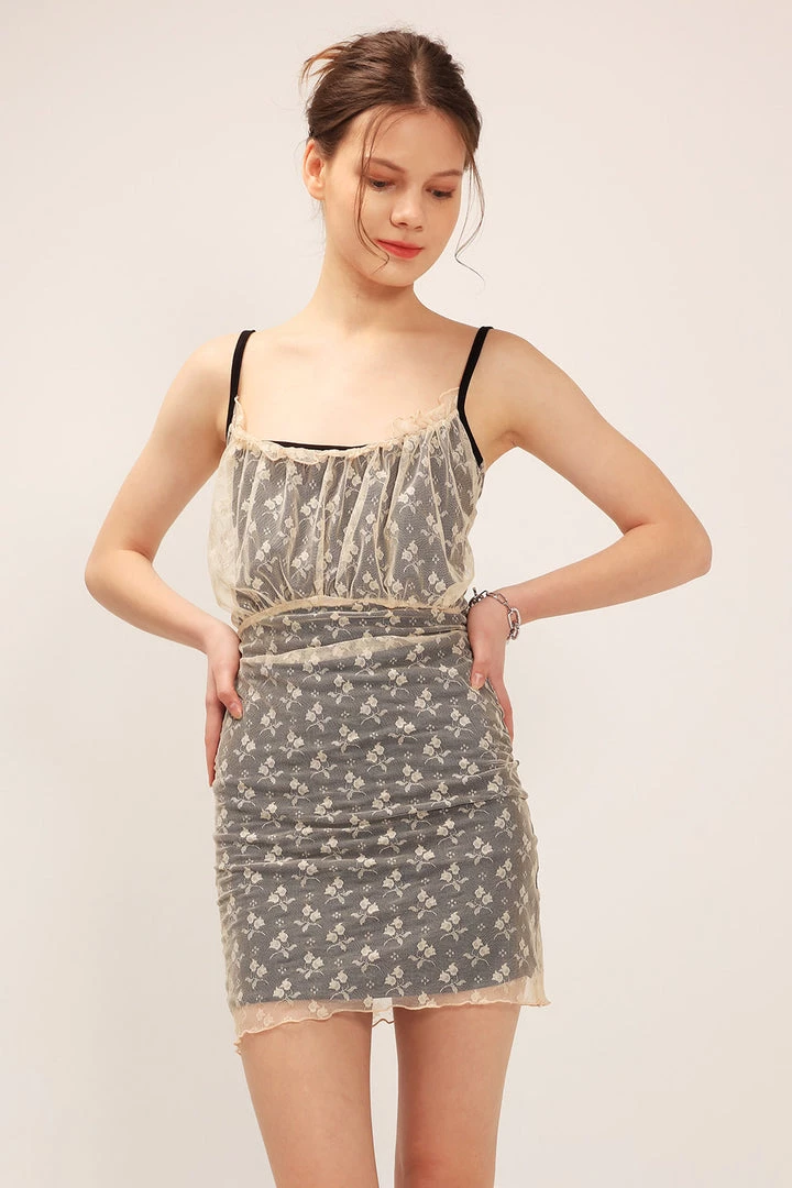 - This dress features a well stretchy material all over, a cami dress design, a floral-lace layered detail all over, and pull on style