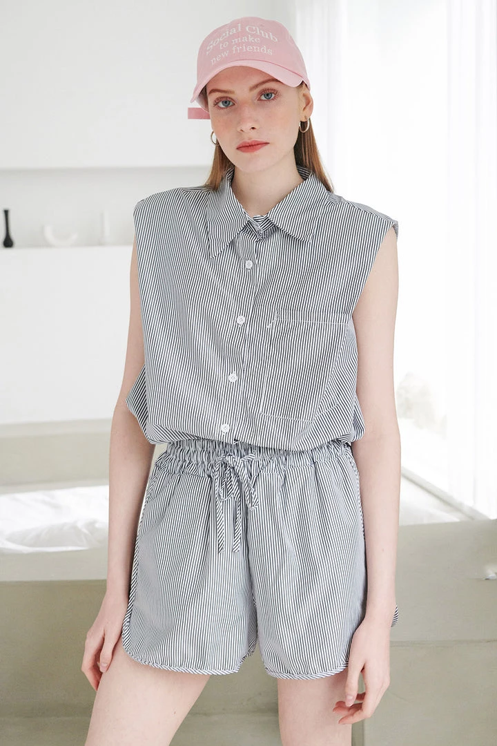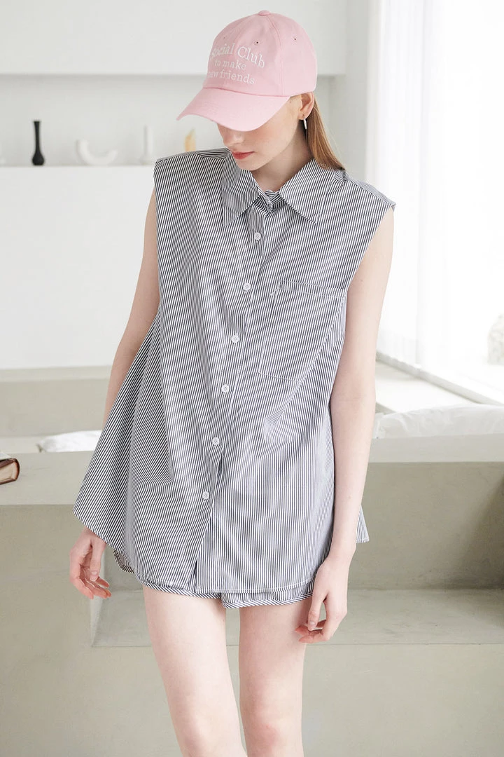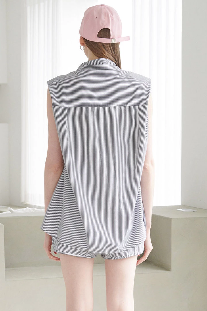 - Top: Front button closure, sleveless with shoulder pads, functional pocket