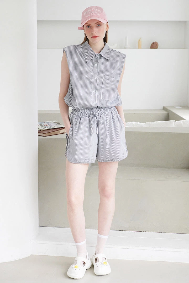 - Bottom: Elasticized waistband, curved hem, drawstring