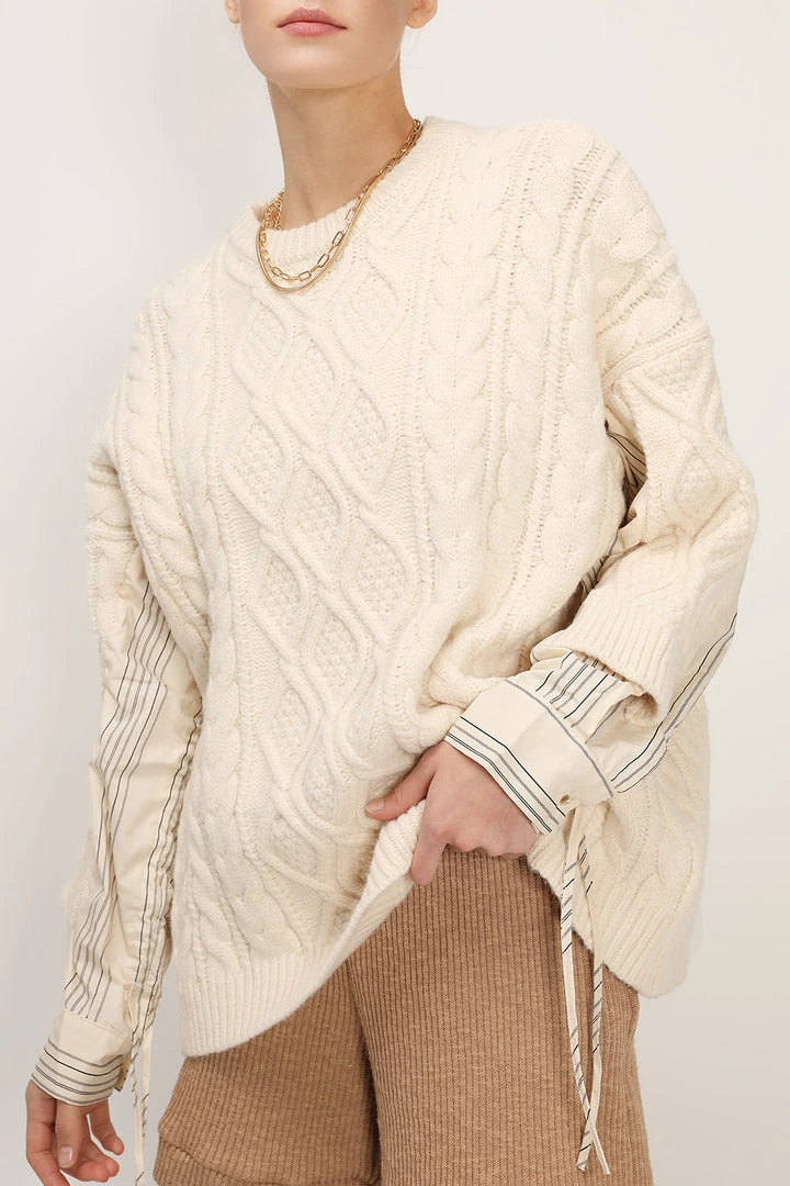 - This effortlessly chic knitted pullover features a shirt splicing design at sleeve, a comfy fit silhouette, a ribbed round neck detail, and pull on style