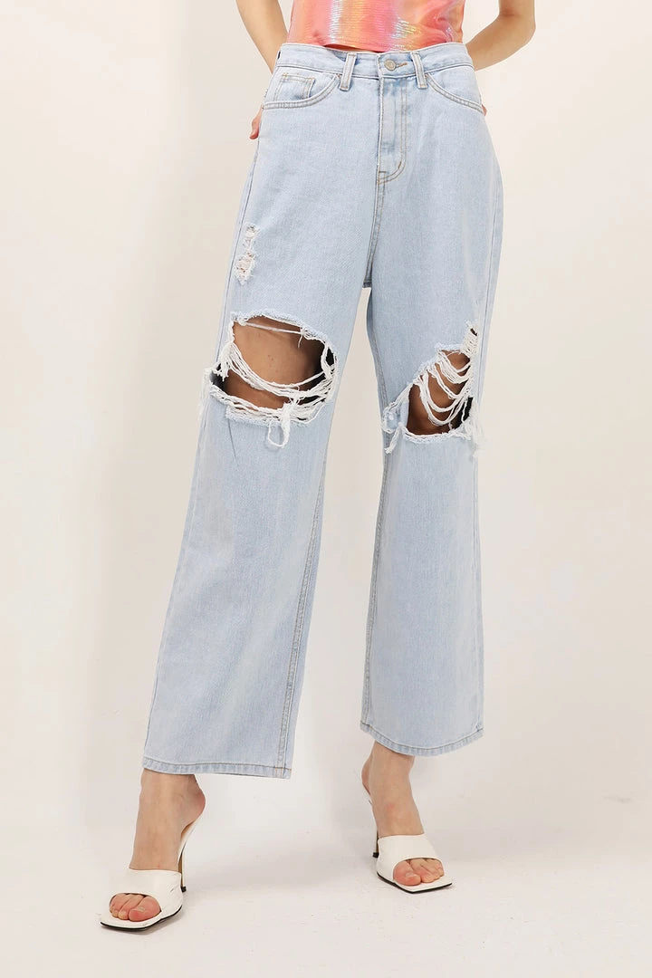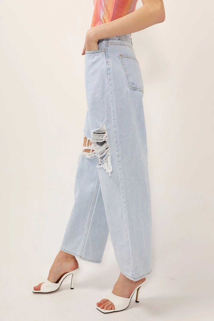 - Featuring a lightwashed denim material all over, a high waist silhouette, ripped cutout details, a full length leg detail, and a zip fly closure at front