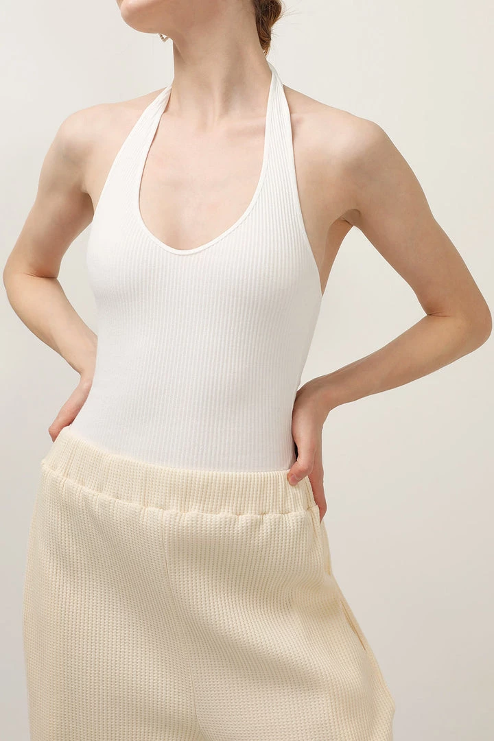 - This top features a knit material all over, a halter neck design, a slim fit silhouette, and pull on style