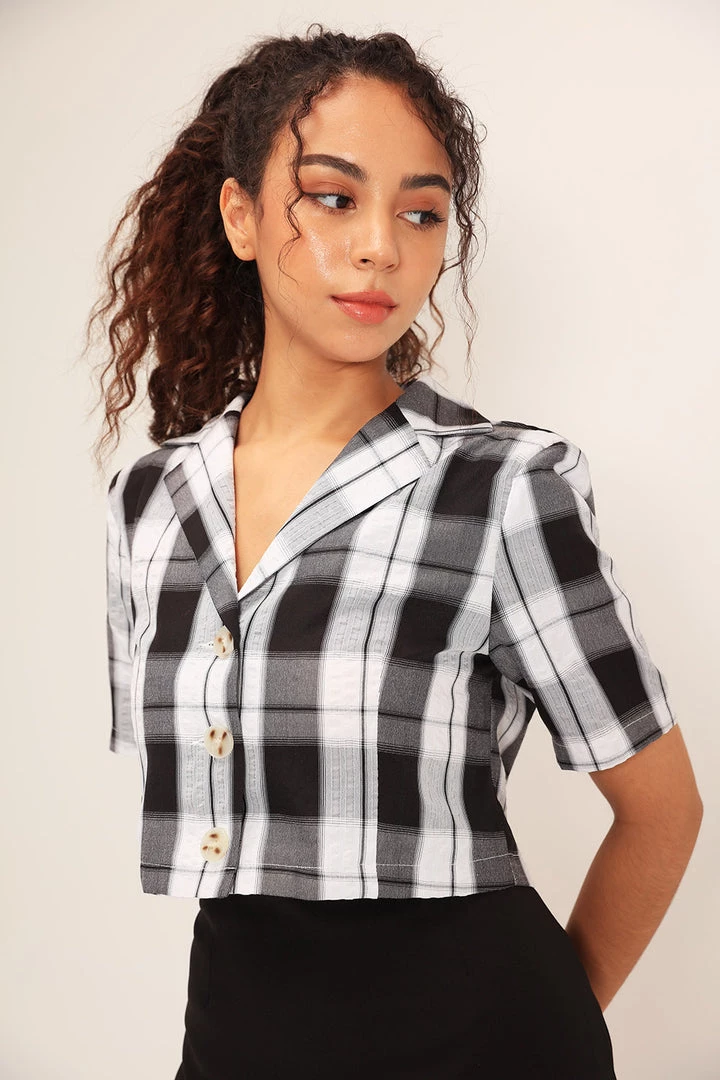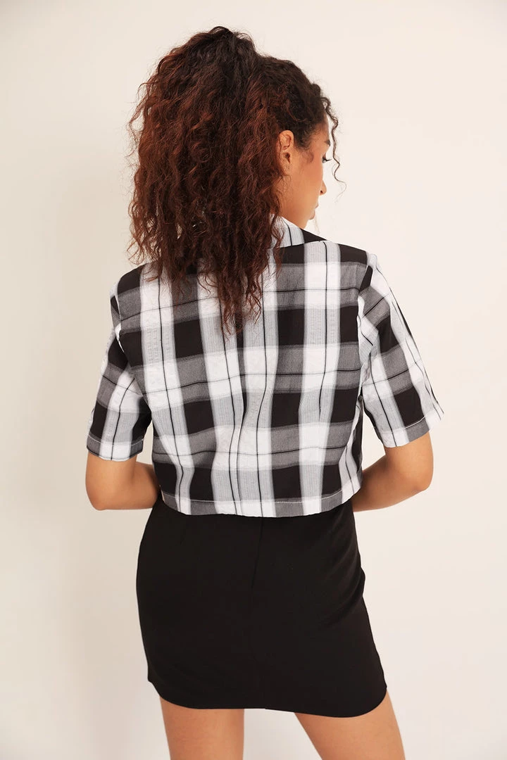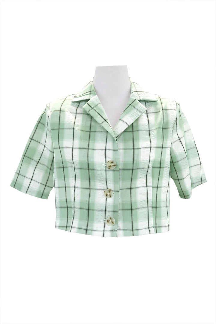 - This jacket features a plaid printed all over, a cropped length silhouette, a notch collar, and marble-button down closures at front