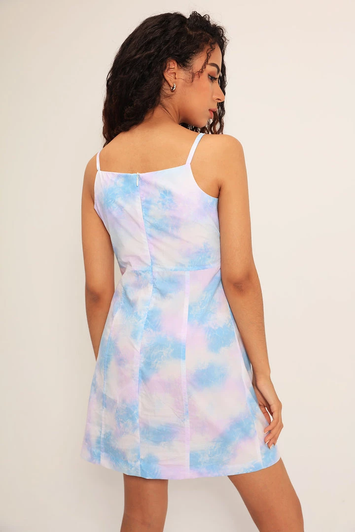 - This cami dress features a tie dye printed all over, a ruched detail at chest with a self-tie string, and a concealed zipper closure at back