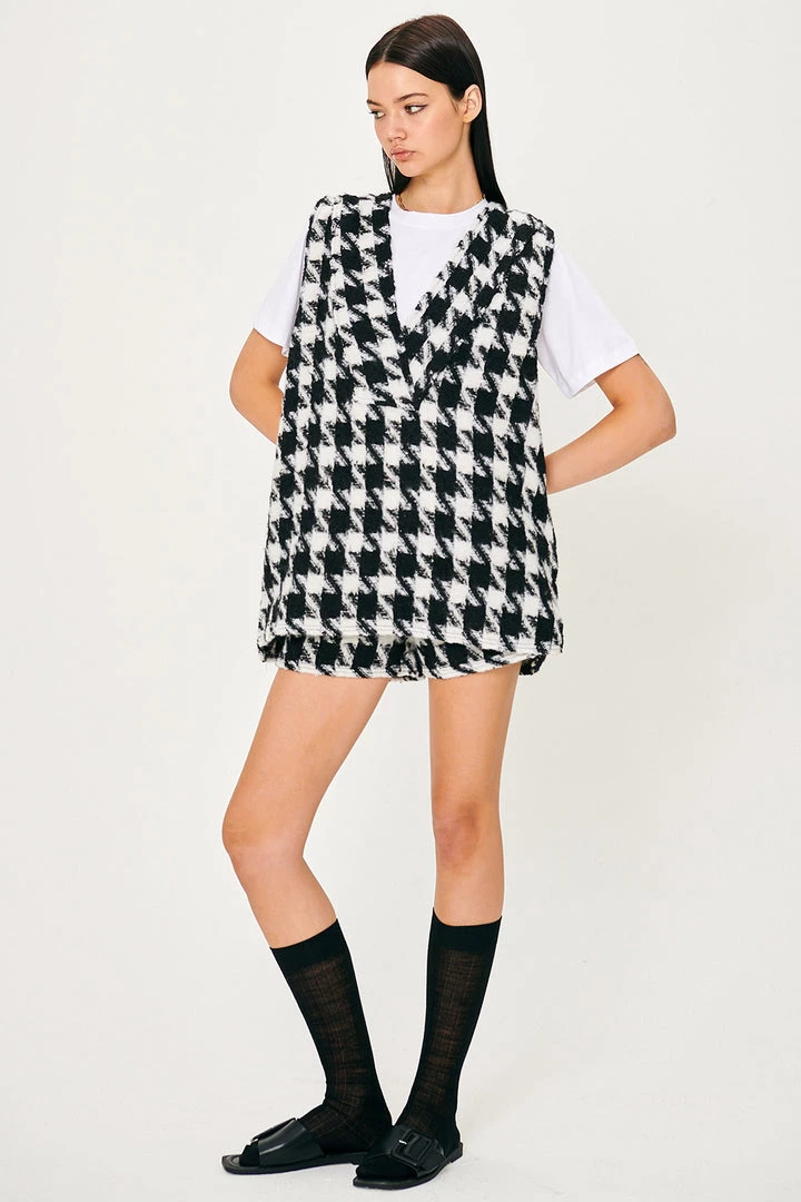 - The co-ord set ; A houndstooth printed oversized fit vest and a pair of shorts 2-piece set