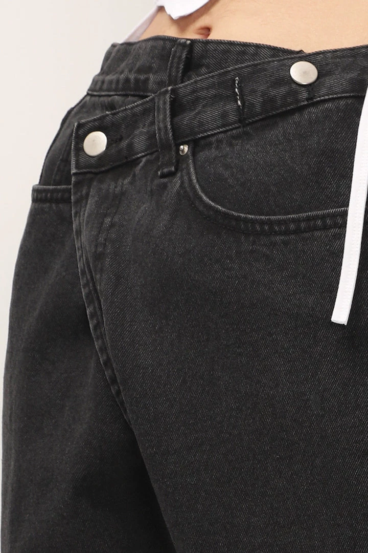 - Featuring a cotton denim material all over, a wrap design at waist with an adjustable buttons, and a wide leg fit silhouette