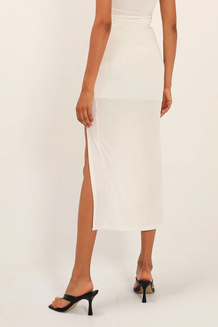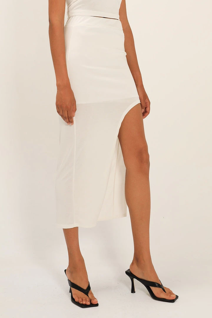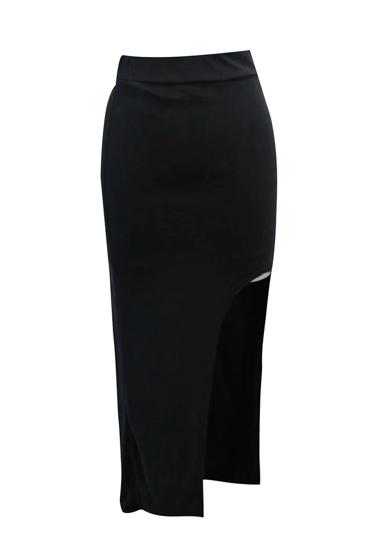 - This skirt features a deep cutout-slit detail at front, a well stretchy material all over, an asymmetric length silhouette, and slip on style