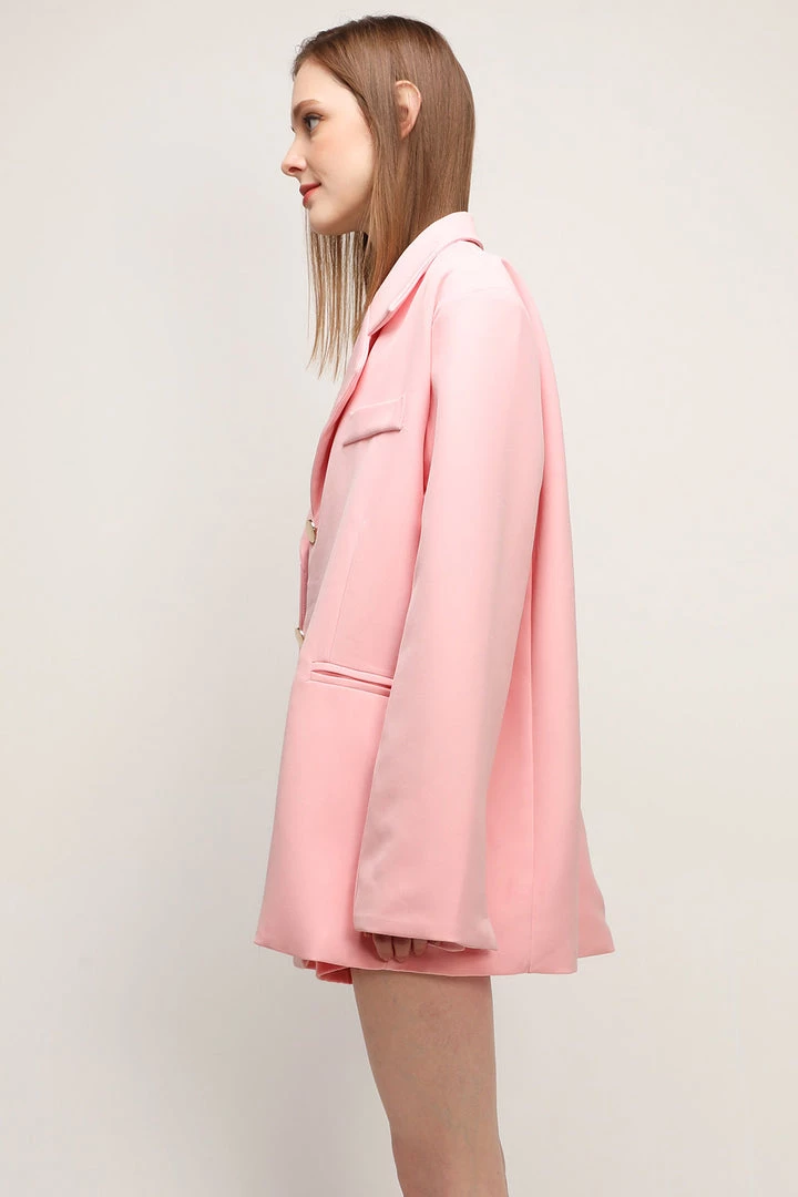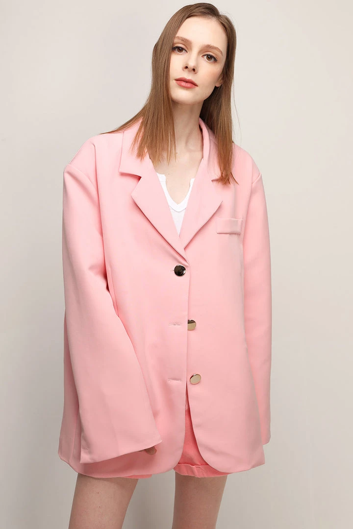 - This blazer features a super oversized fit silhouette, a loose fit design, a notched collar, dual pockets at front, a single breast silhouette, and button closures at front