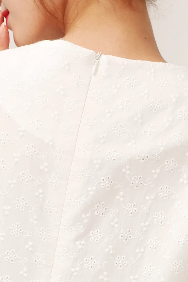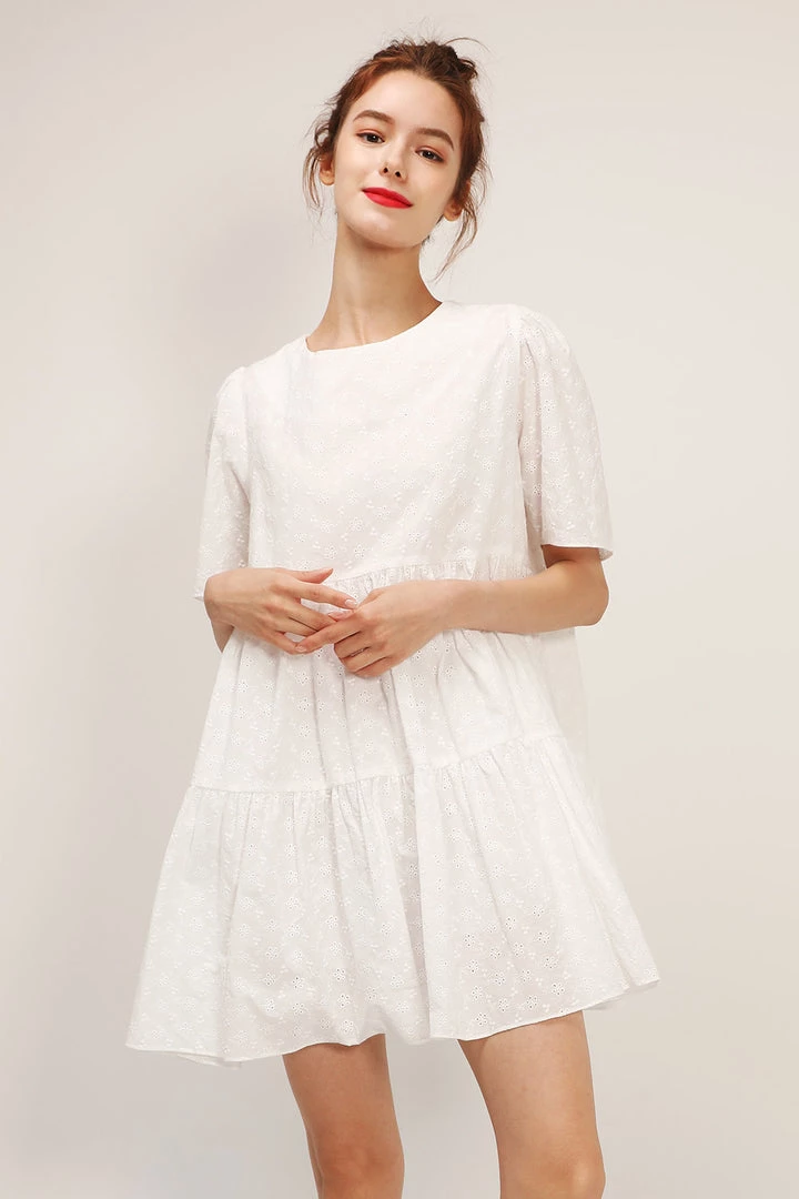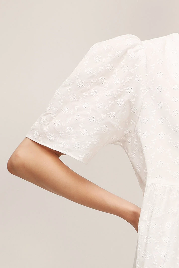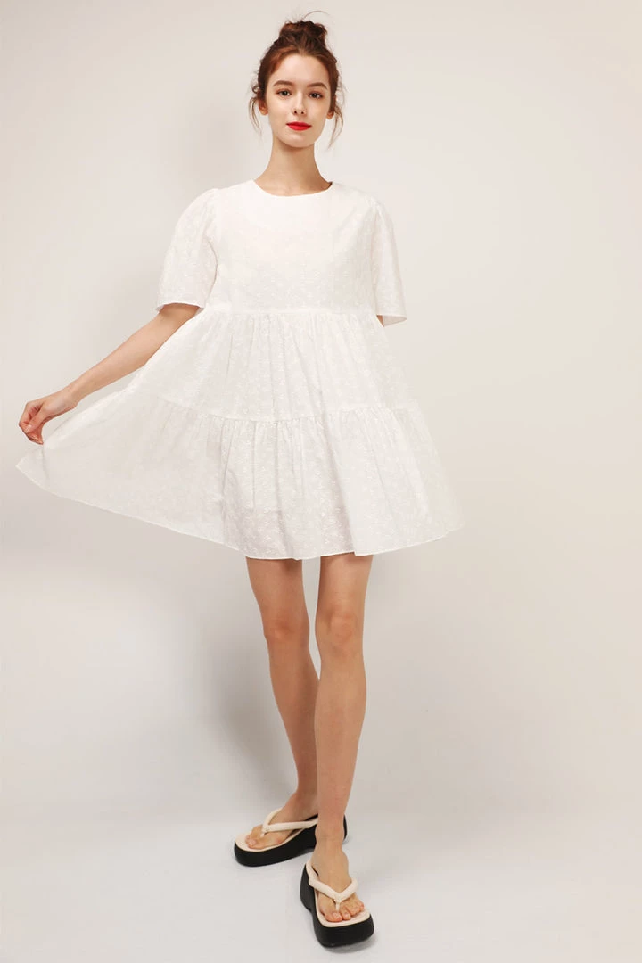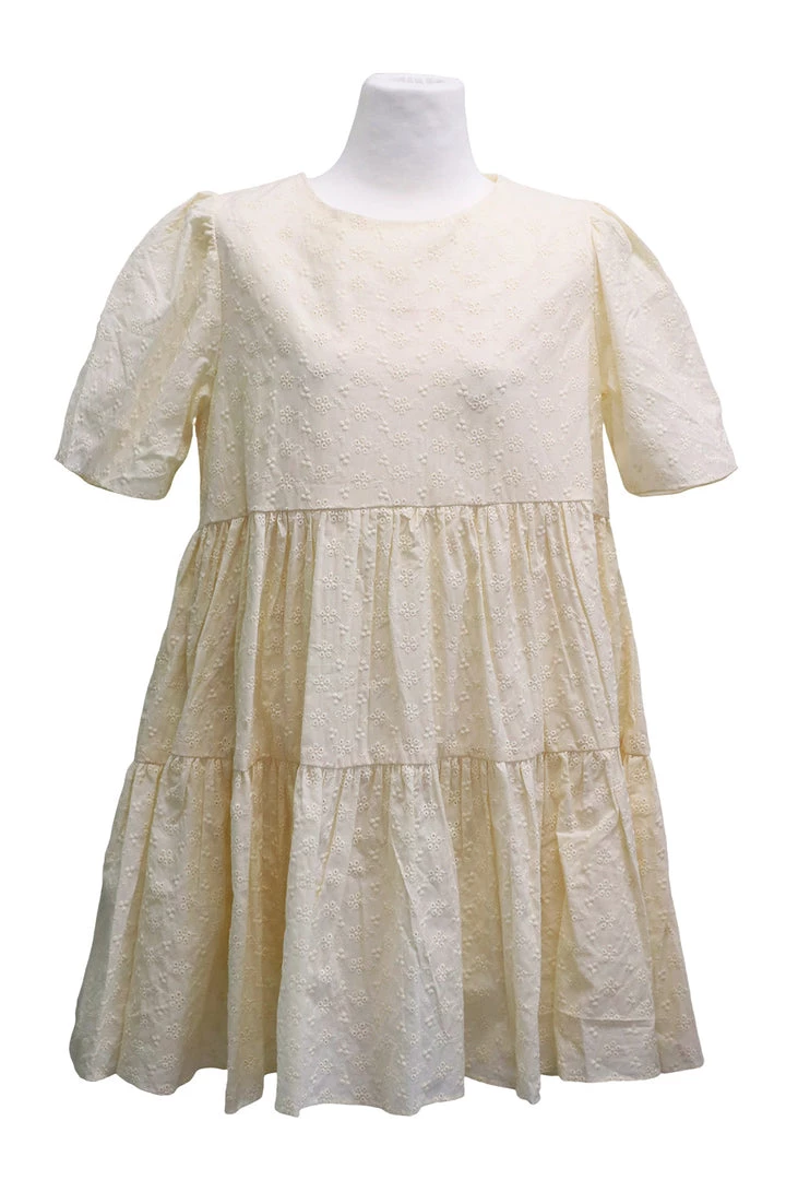 - This dress features an embroidered lace material all over, a round neckline, a tiered hem design, voluminous sleeves, a high waistline silhouette, and a concealed zipper closure at back