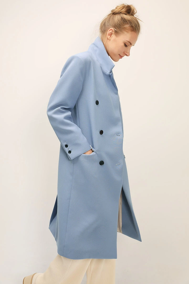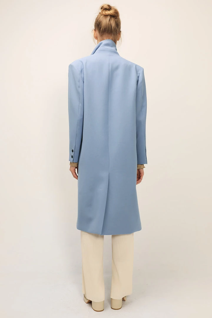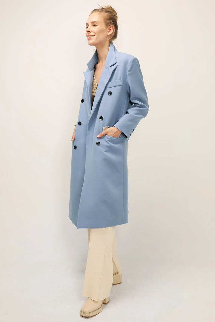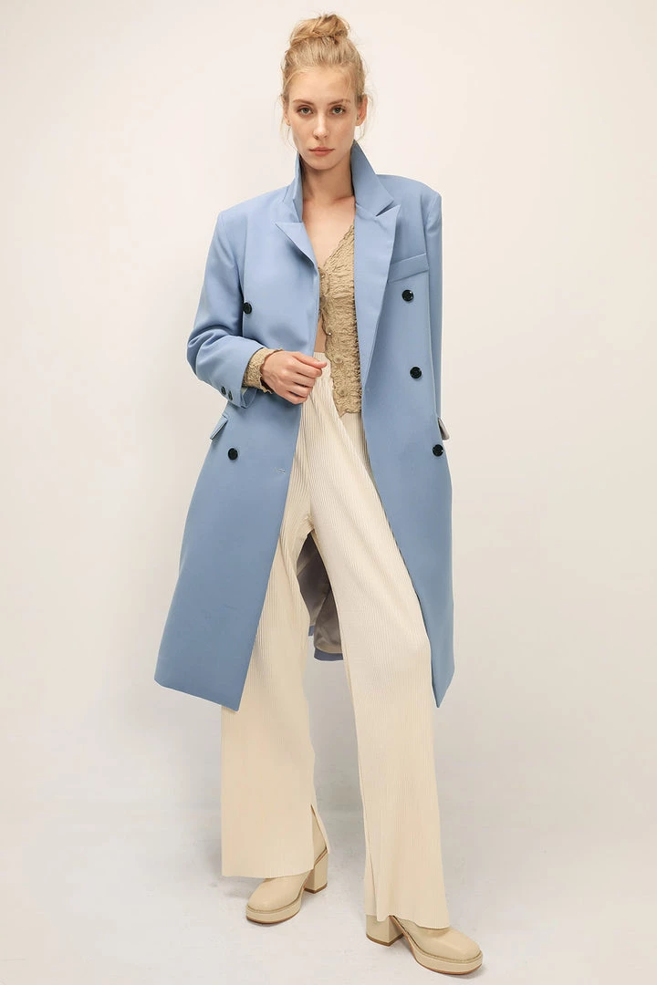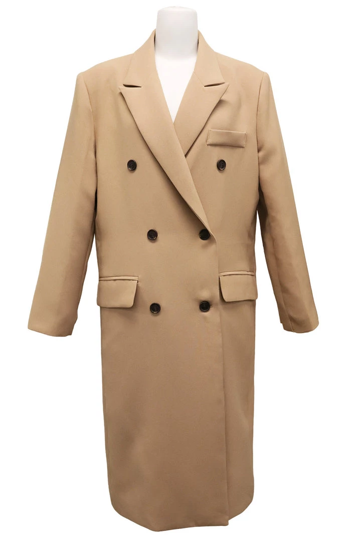 - This coat features a notch collar detail, a padded shoulder design, a double breast silhouette, dual pockets at sides, and a maxi length silhouette