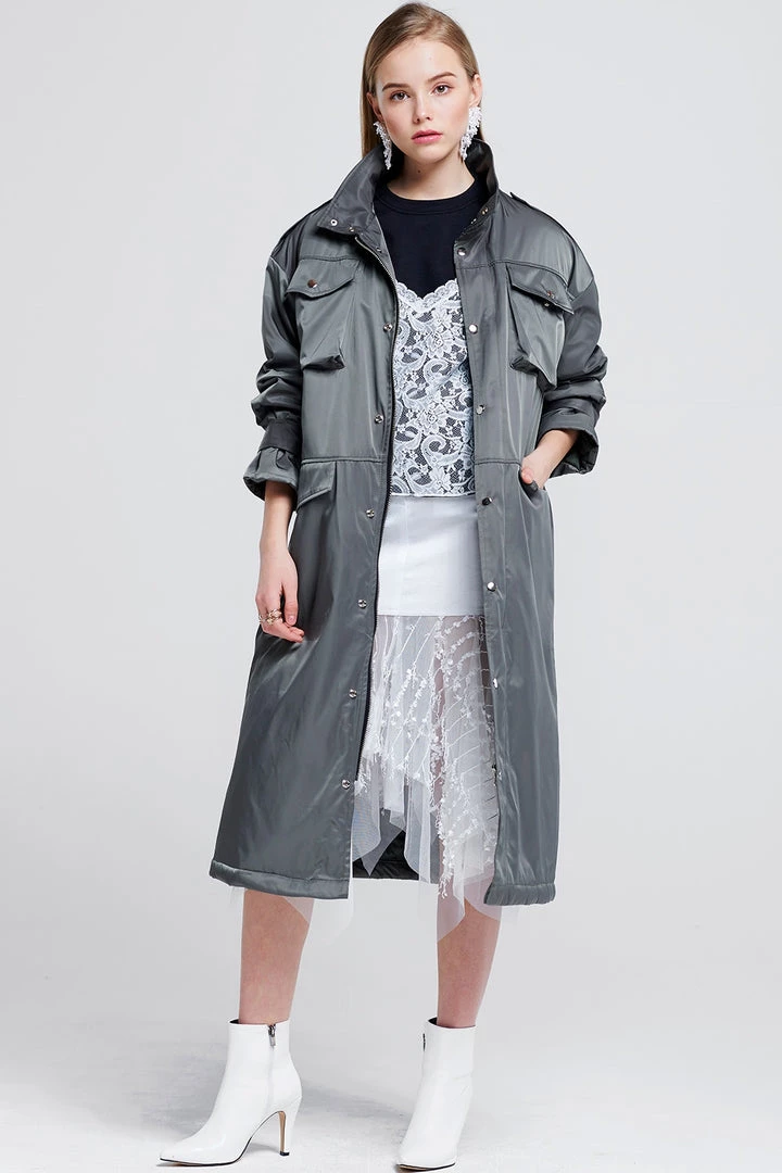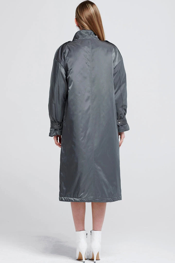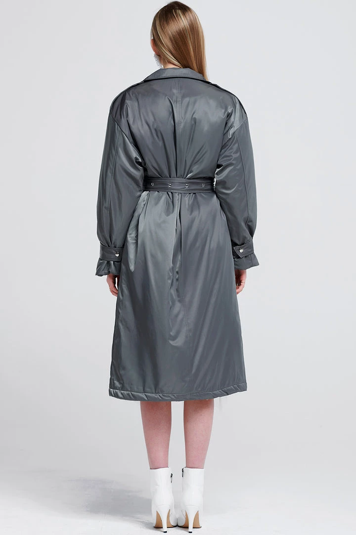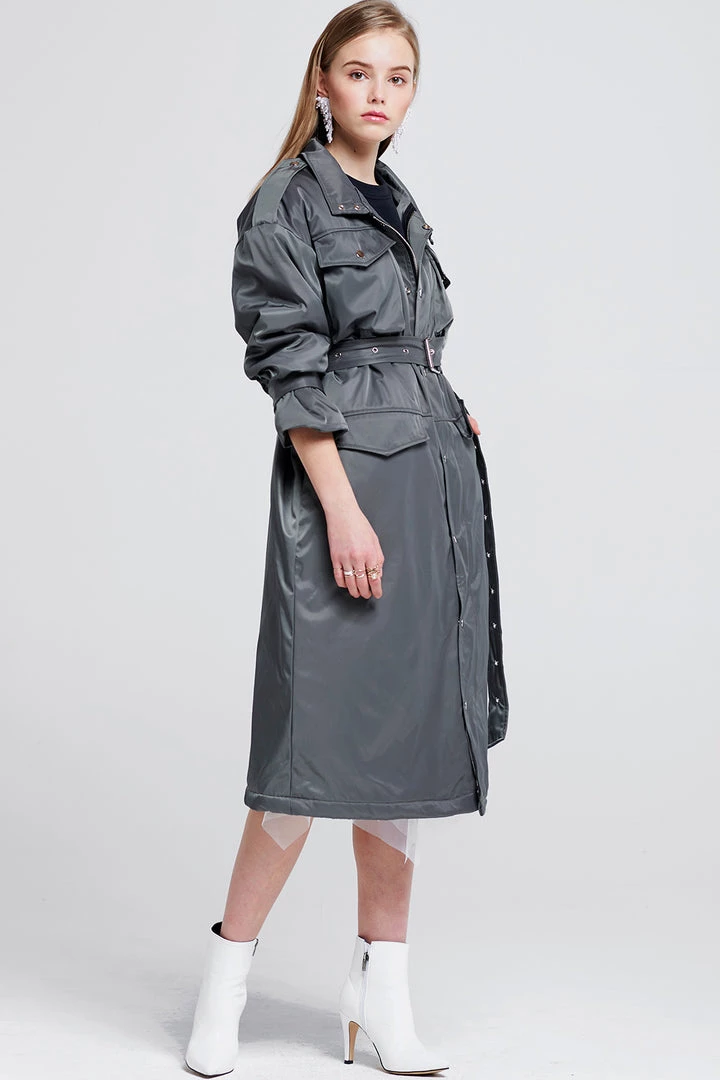 Ready for spring, this synthetic trench coat will keep you dry. Keep it cinched with the long, long included belt or wear it open over your outfit. It comes with belted sleeves for a short-sleeved styling option.