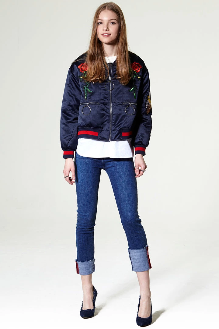 A trendy cropped bomber with a satiny texture. The navy blue background is contrasted with bright red stripes and rose embroidery on either side of the chest. A cotton hem can be attached to the bottom of the jacket to make it appear less cropped.