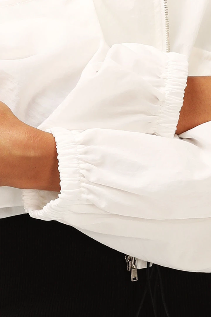 - This windbreaker features a lightweight sheer material all over, a high neckline, a cropped length with a drawstring detail, and a zip-up closure at front